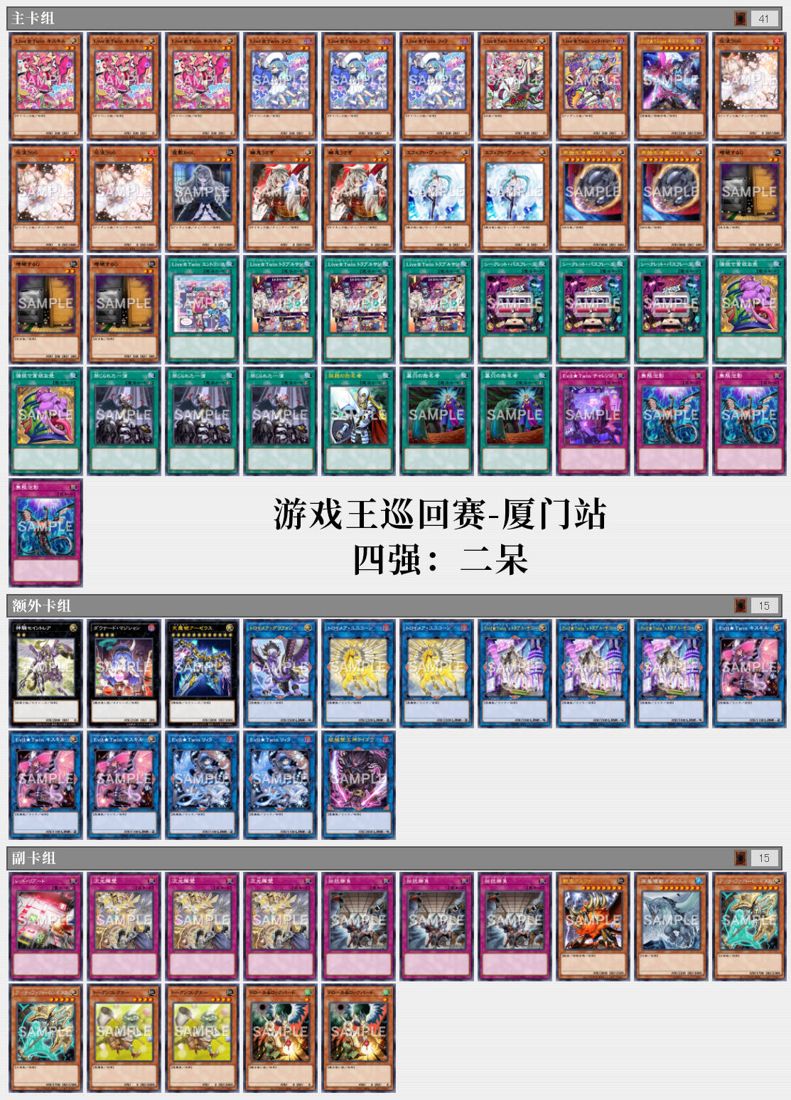 【直播☆双子】是出自系列补充包 创世冲击者(DBGI)的三个系列之一,有着极高的人气。这个系列以单卡便可做出连接值4、3300面板、可以二速解放拉出墓地的两只双子各1并触发其中连接怪兽效果(抽1、炸1)、墓地还有个不取对象解场能力的『Evil★Twin'sトラブル・サニー』(桑尼)来作战。这个系列的主打战术非常简单,相信很多玩家都听过“通召小蓝拉小红……”的口诀。【直播☆双子】这一套单卡展开可以当回合抓1张牌,回合外再次触发连接怪兽抓1和除去1,并通过墓地的『Live☆Twin キスキル・フロスト』(圣诞红)回合外可以再次抽取1张牌,也就是说,这套卡组除了围绕完成这么一个单卡展开的combo的卡片外,其他卡位都可以是干扰对手战斗的卡片,二呆选手主卡组投入了13枚手牌诱发效果怪兽和3枚『无限泡影』,副卡组还有其他可以根据对手卡组类型换上的手牌诱发怪兽。