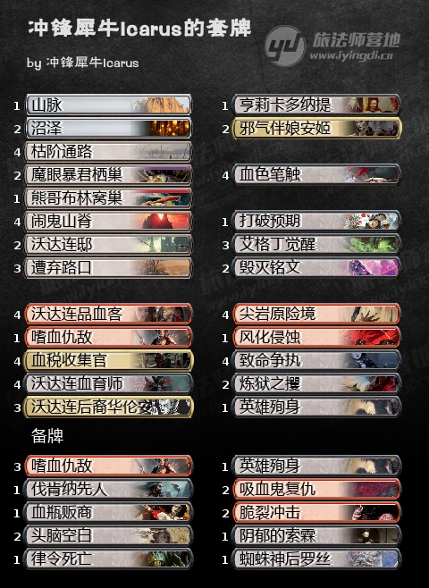 炼金的第一套登顶牌是一套红黑吸血鬼,它的流行度稍有波动,不过一直都是meta中的一份子。Countinho_Brewer的套牌对抗白蓝色组的控制牌很强力,这套偏中速的快攻打到了121名的好成绩。