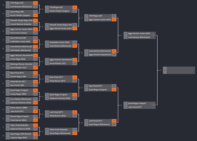 所以除了结果以外,这个活动里最有意思的部分其实应该是最开始那64套入围卡组的名单。给出这份名单的Chakki既是古神级别的选手,又是官方设计师,虽然他没有细说这64套牌的入选依据,但这依然是炉石社区目前能列出的最权威的名单了: