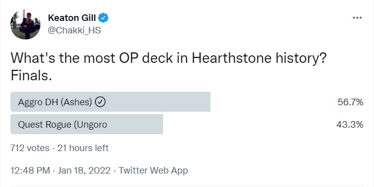 在过去的一周里,平衡组(已经是资历最老的)设计师Chakki在推特上组织了一场炉石版的关公战秦琼,由社区票选炉石史上最强的(标准)卡组形态。整个票选今天开启了最后一轮的决赛,是外域版本刚上线时的恶魔猎手对决安戈洛版本的任务贼,目前恶魔猎手已经有了比较明显的优势,胜负基本已分。