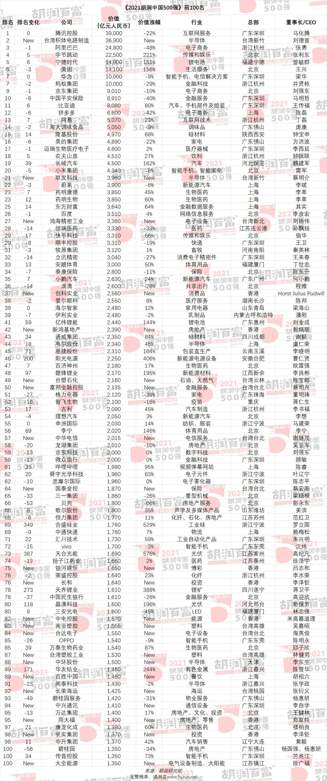 1月19日,胡润百富发布了《2021胡润中国500强》榜单,榜单列出了中国500强非国有企业,并按照企业市值或估值进行了排名。