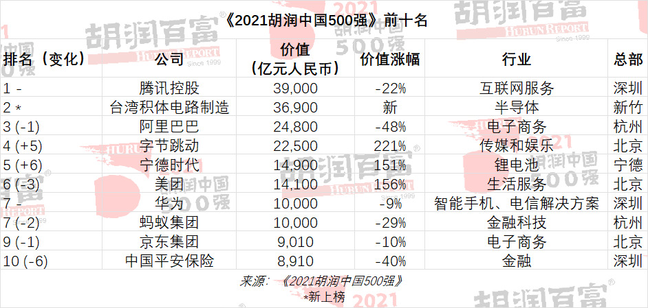 第四至第十名分别为:字节跳动、宁德时代、美团、华为、蚂蚁集团、京东集团和中国平安保险。