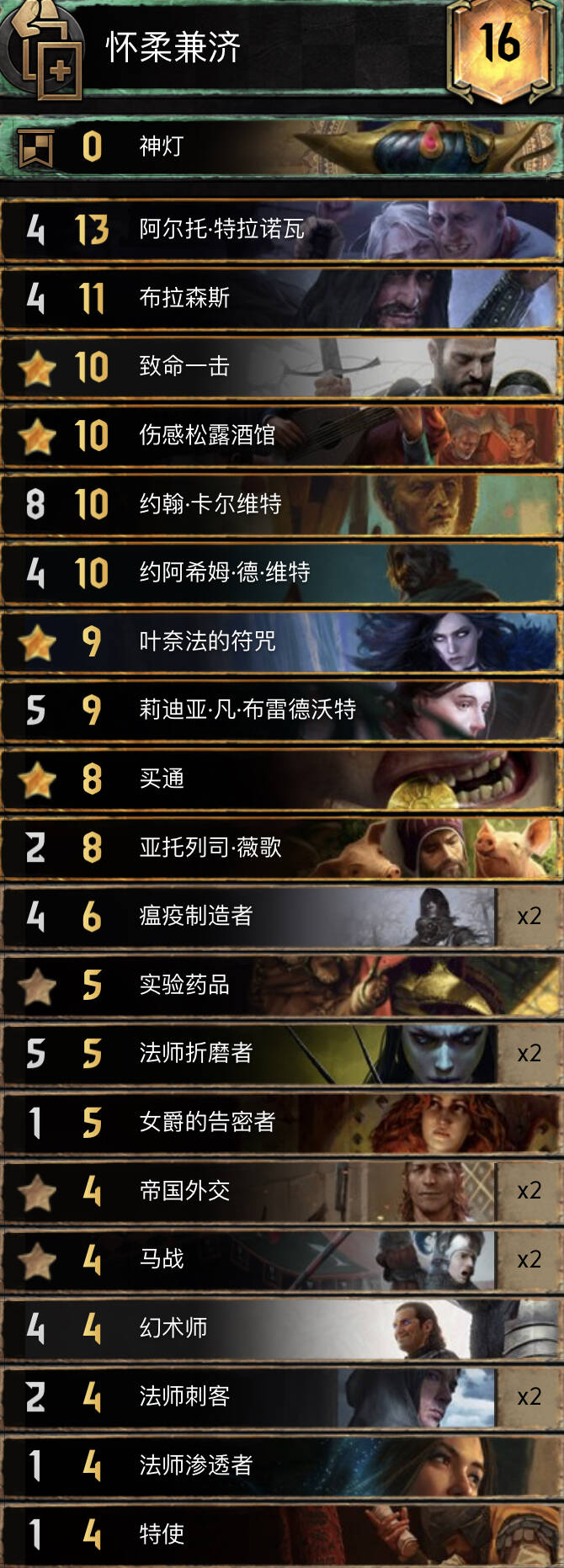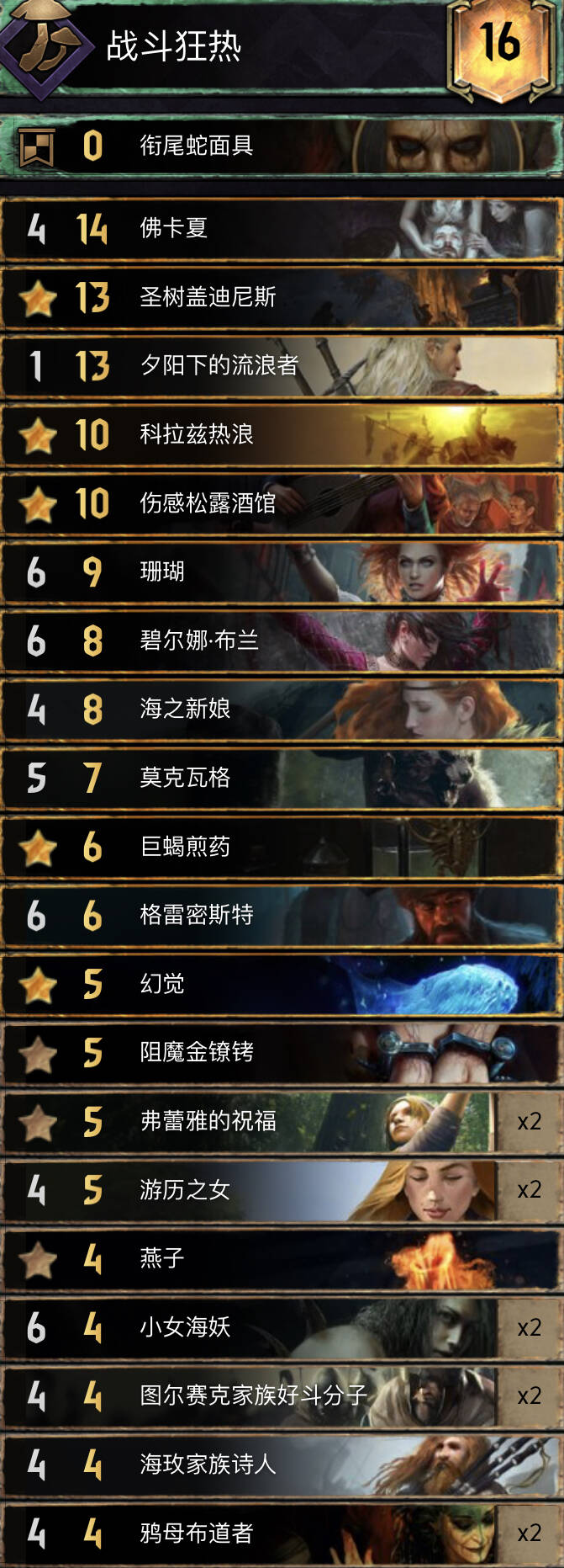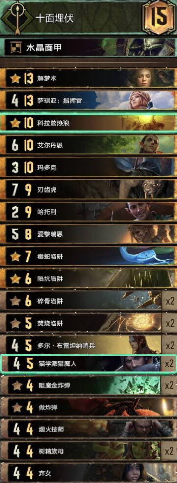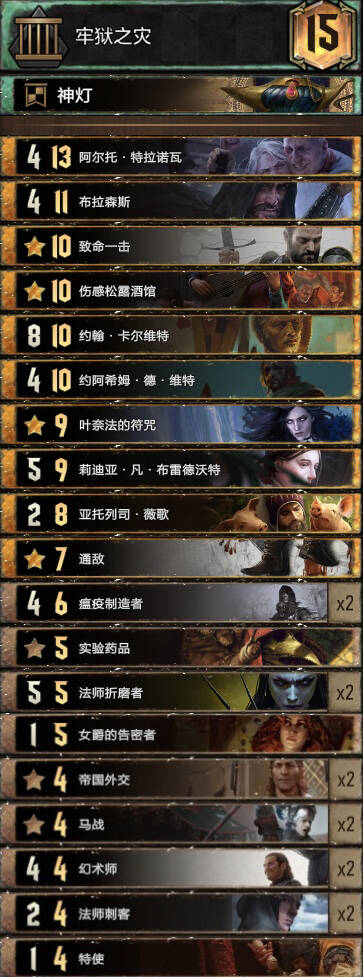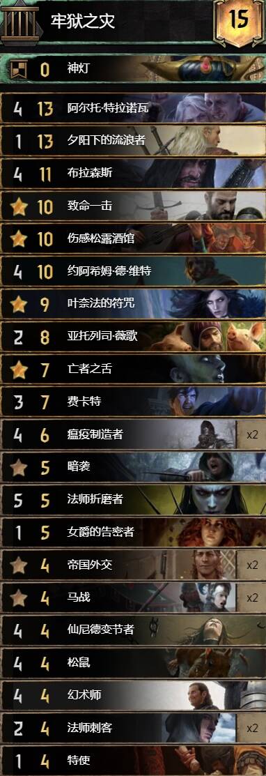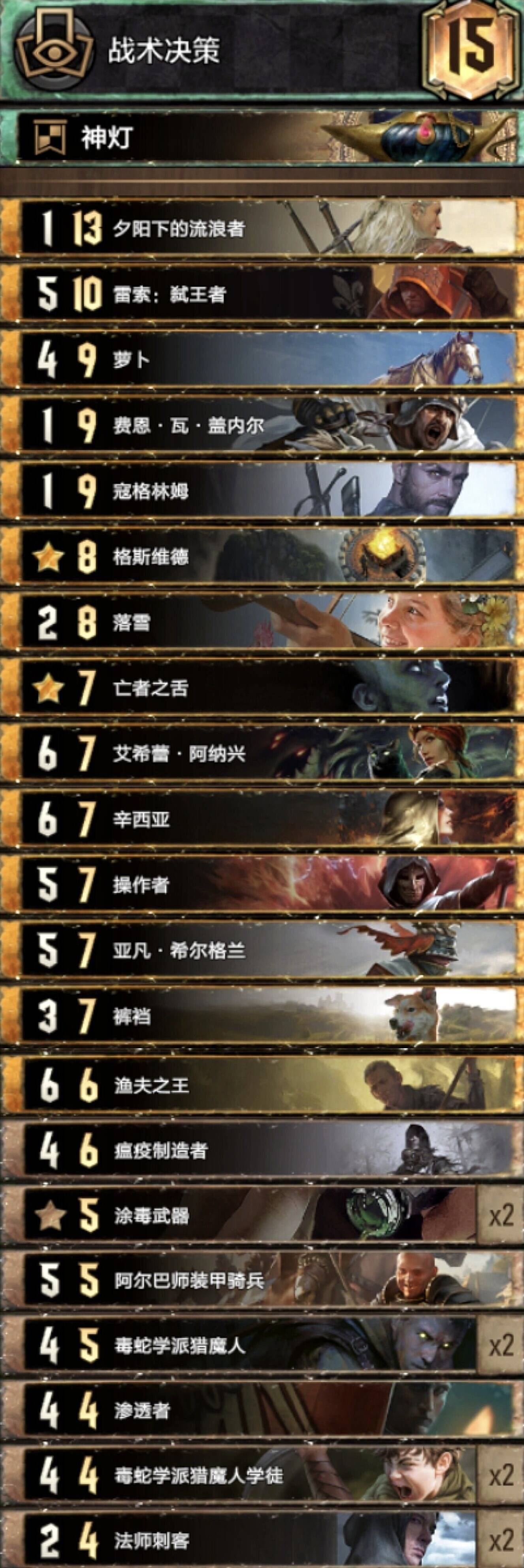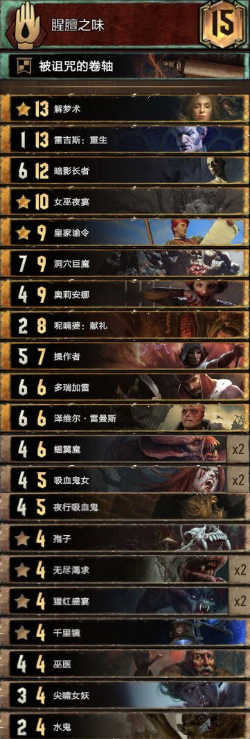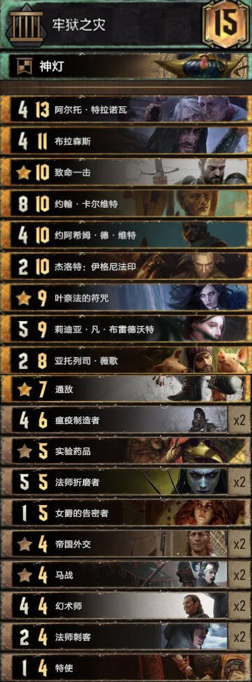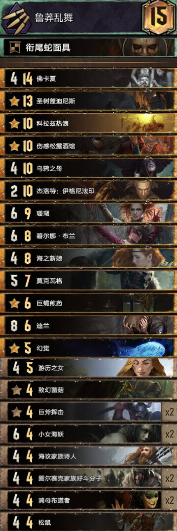 前朝的剑,比较经典的余晖构筑。基本上R1打三张就走,不要投入太多的资源。有余晖和舌头费卡特的点数支持不会被直接莽穿。 实测对怪兽还是蛮优的。内战也和捡破烂的猎魔人对过两局1比1比较看自己的水平,记得不要先下法师折磨者与油炸。对阵辛迪加切勿舌头加在基础战力较高的单位。然后将牌库滤的剩下法师折磨着拉法师折磨者可以少用技能处理老太太。 换卡方面微歌换女画家。松鼠换预言家或者巫医。 怪兽多就换成怀柔兼济吧余晖换成热浪即可。然后带点小解。