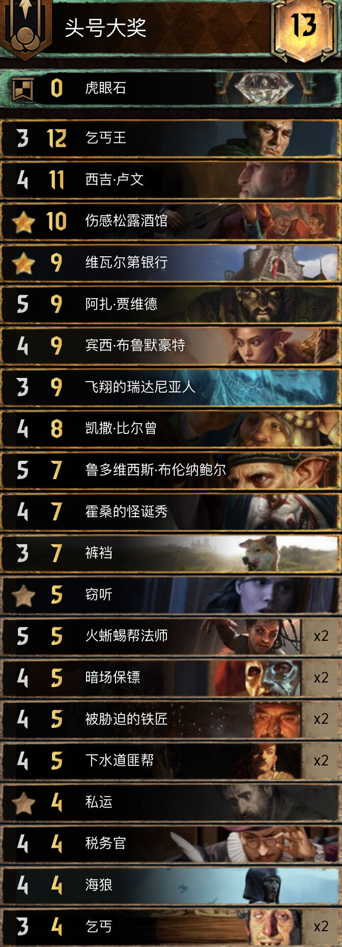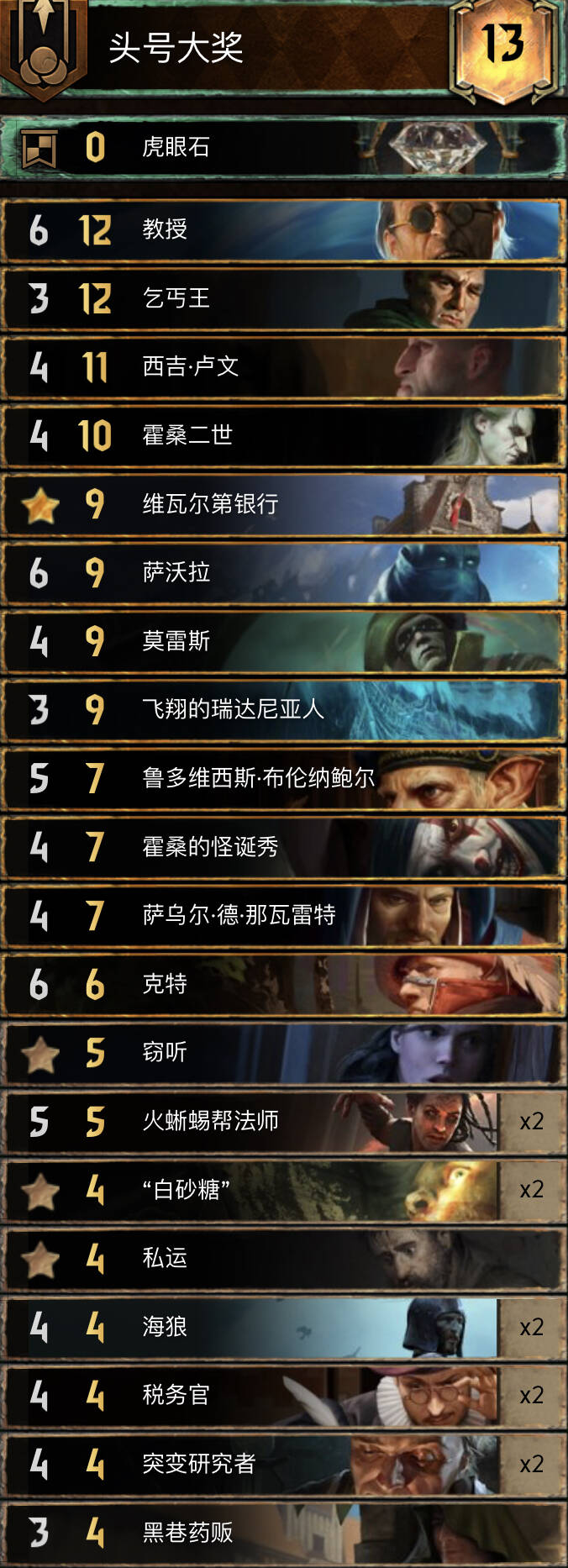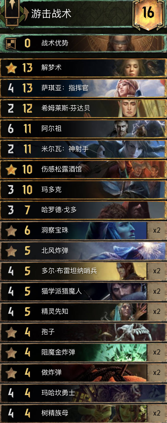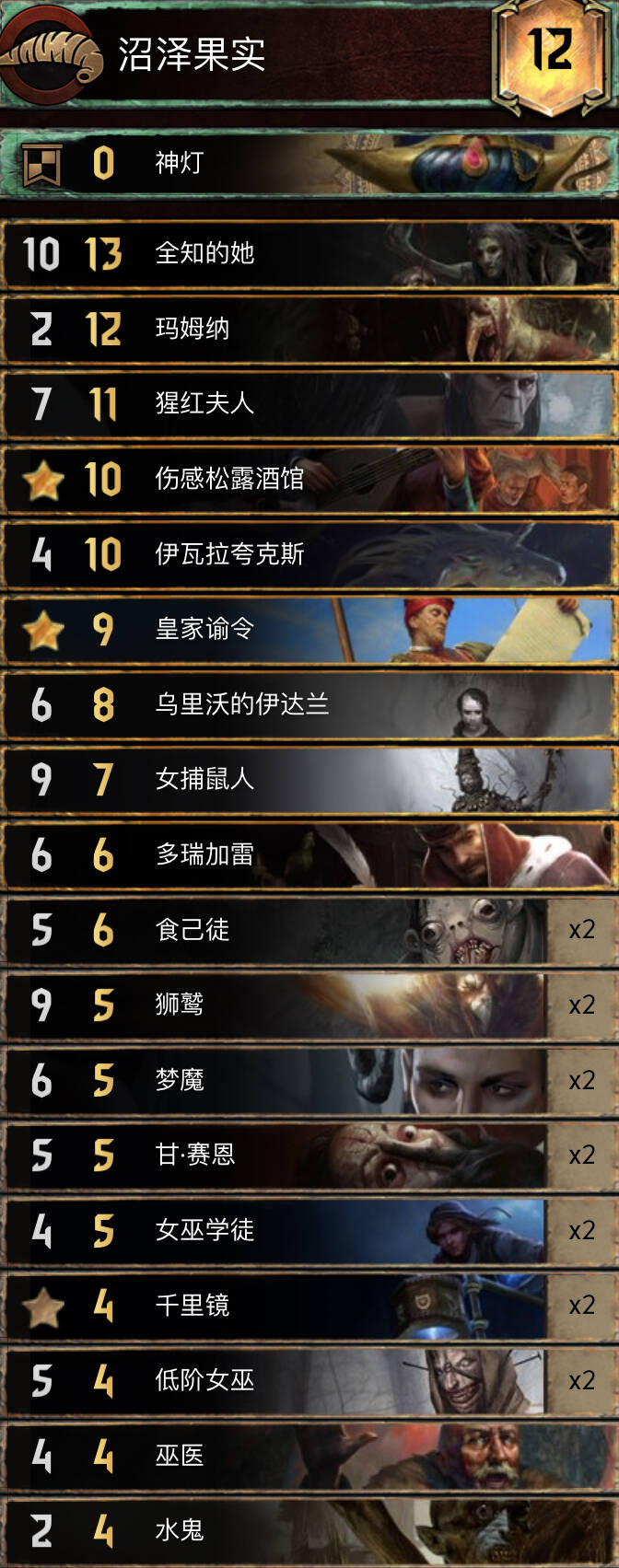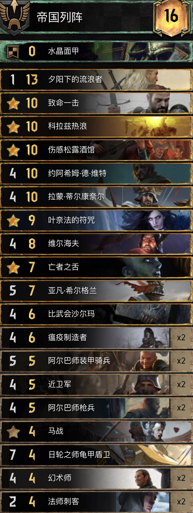 前朝的剑,比较经典的余晖构筑。基本上R1打三张就走,不要投入太多的资源。有余晖和舌头费卡特的点数支持不会被直接莽穿。 实测对怪兽还是蛮优的。内战也和捡破烂的猎魔人对过两局1比1比较看自己的水平,记得不要先下法师折磨者与油炸。对阵辛迪加切勿舌头加在基础战力较高的单位。然后将牌库滤的剩下法师折磨着拉法师折磨者可以少用技能处理老太太。 换卡方面微歌换女画家。松鼠换预言家或者巫医。 怪兽多就换成怀柔兼济吧余晖换成热浪即可。然后带点小解。
