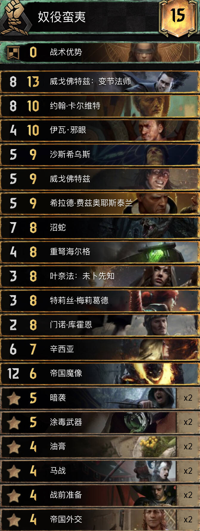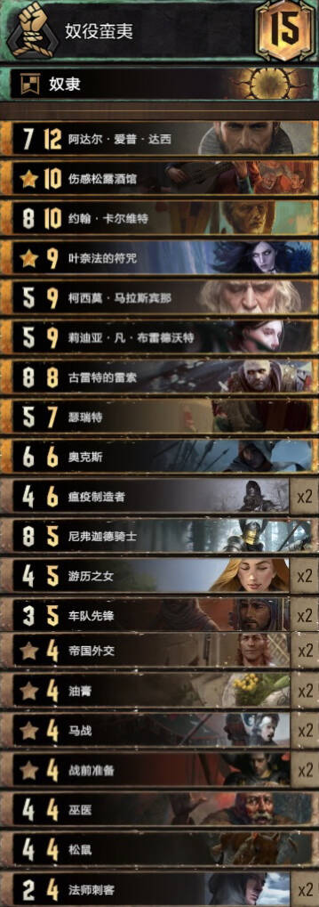 这套有很多可以替换的牌,比如达西换油煎/里恩斯/斜眼,进化换贿赂,骑士和一张车队换偷墓和暗杀等等,甚至领袖都可以换成锁。主要思路是无引擎,无大绿字,多控制,高点数。约翰可以保证酒馆上手,两张游历每张10点,这样可以保证铜卡点数也非常大。进化可以配合车队赌上限,也可以单纯当友方净化,节目效果牌。除非r1手里都是金卡,不然r1基本直接赚1卡输,r2靠着一手金卡保卡差,r3短局由于铜卡点数大也不怕,如果打10卡r3由于手里多控制且每一手牌点数都很大,根本不虚,整体有点类似老昆特间谍帝国的节奏。