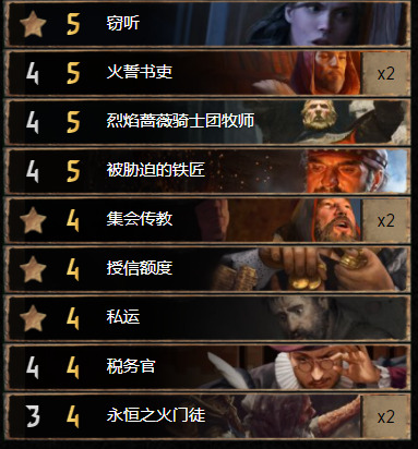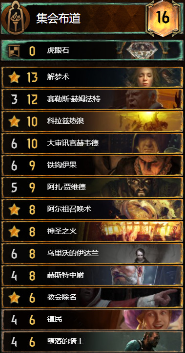 打法:核心组件为塞勒斯赫姆法特,铁钩伊果 ,镇民,乌里沃的伊达兰 ,r1r2除了四核所有牌都可以交 。r1火誓混,一般先交门徒,然后连续引擎,只要有钱赚或者有点爆就可以开技能,然后集会或者大审讯官爆一波单位,接神圣之火,然后再爆一波单位并开神圣之火的指令,打下来也有30-50点左右,打深的话手牌没有核心牌打完也行。r1技能开1-2次,并且亏卡赢不是完全不能接受,解梦r1上手一般用来拉神圣之火,因为之后神圣之火没用,换牌和检索找2个火誓书吏。r2不打,r3核心组件按顺序扔。