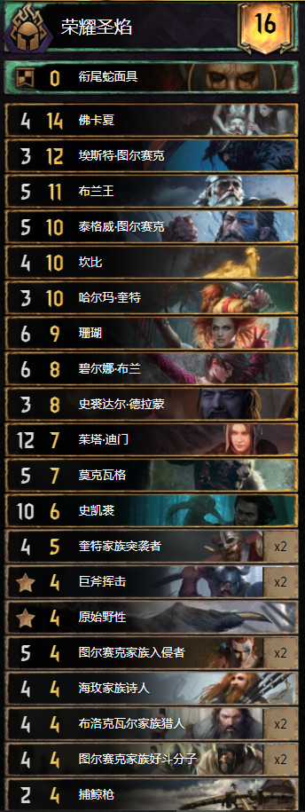 打法:r1开萨奇亚前排滤牌存点,没有了多尔·布雷坦纳哨兵 你的单位会很脆但是为了存点的收益选了前排,只能说见仁见智吧,r2还是存点,被逼牌就交牌吧,反正有三个大点数牌想交就交,特别的推荐毒蛇陷阱第一张翻开解对面巨强,还多一个类别。
