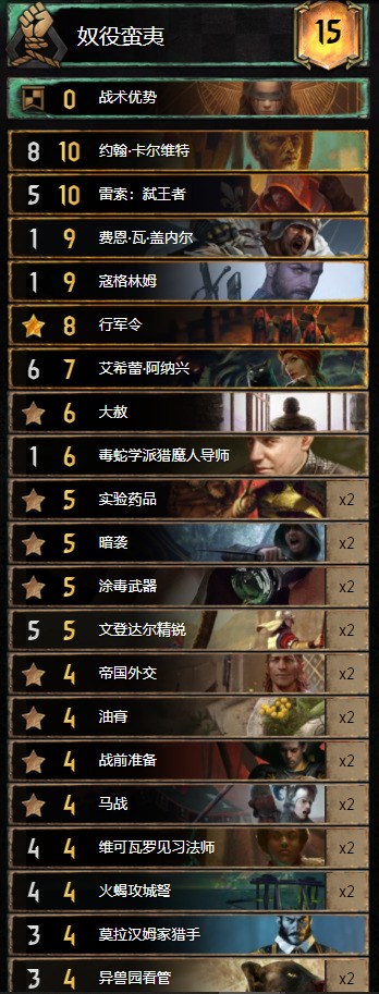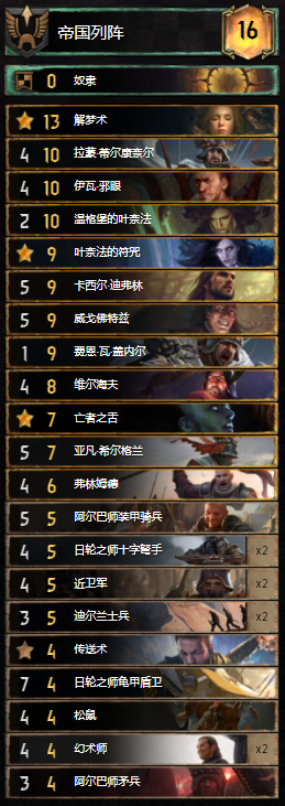 额外附一张我用来上职天的士兵帝国,靠护甲当时打松鼠还算胜率不错,特点是卡西尔叶奈法白赚增益。