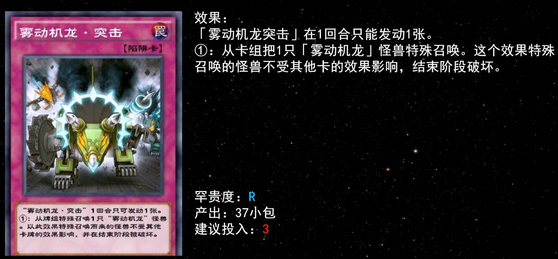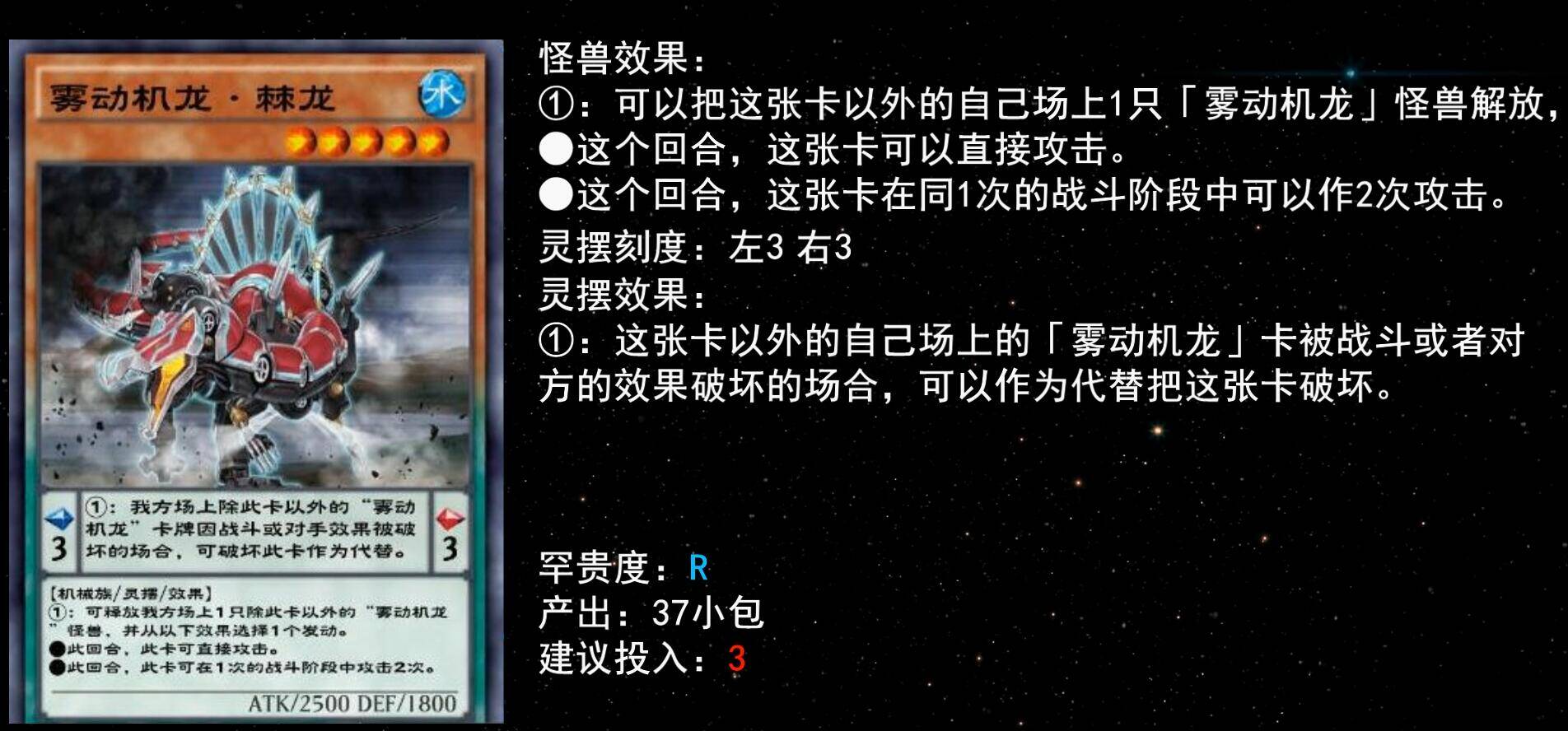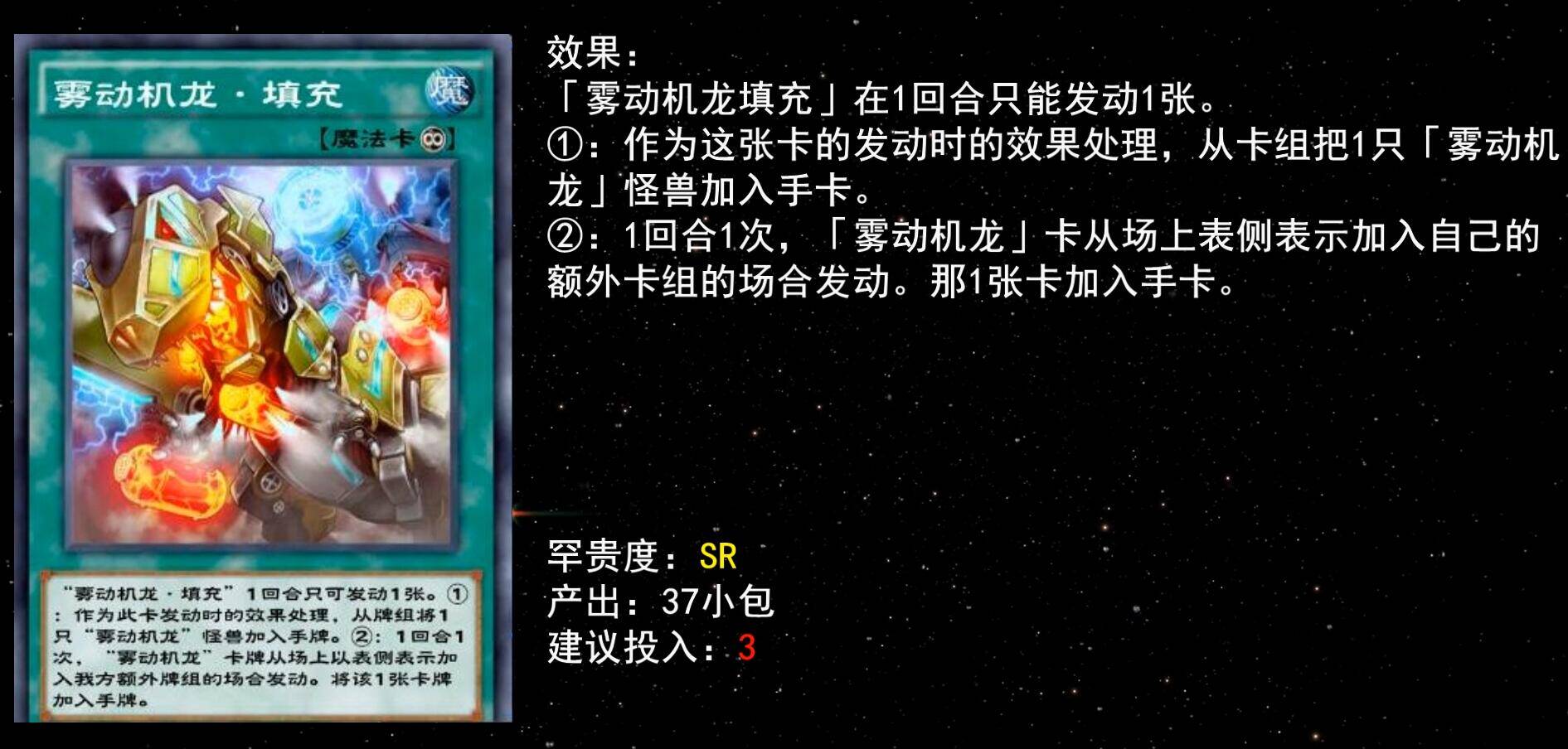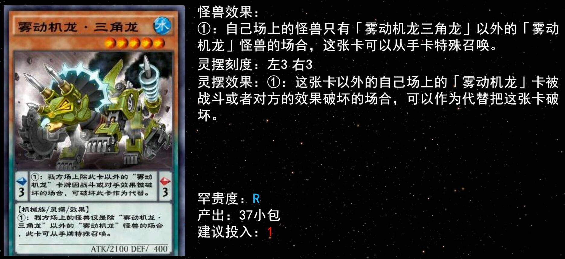 同样的还有5星三角龙,自己场上怪兽仅有雾动机龙时可手牌特召,补充输出很实用,建议至少下1。