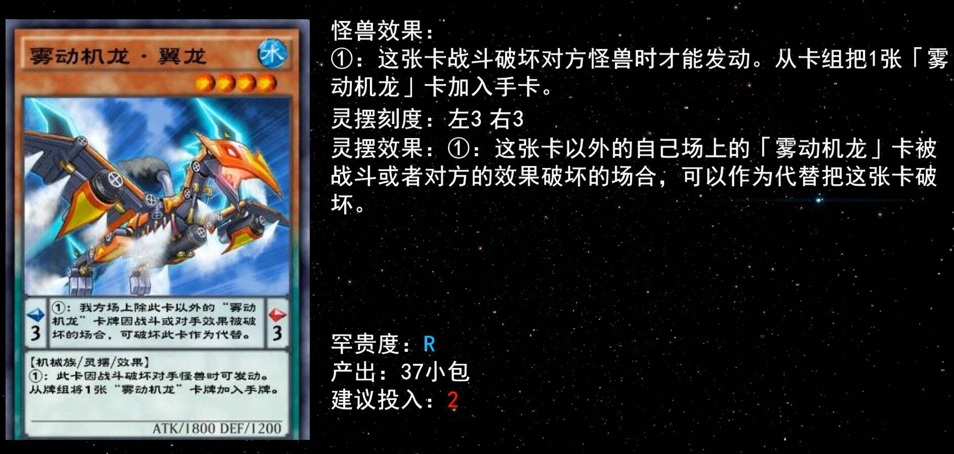 同为刻度3的雾动机龙,翼龙战破对手怪兽时可检索本家卡,作为灵摆魔法时和棘龙一样有着代破能力,实用性很高至少下二。