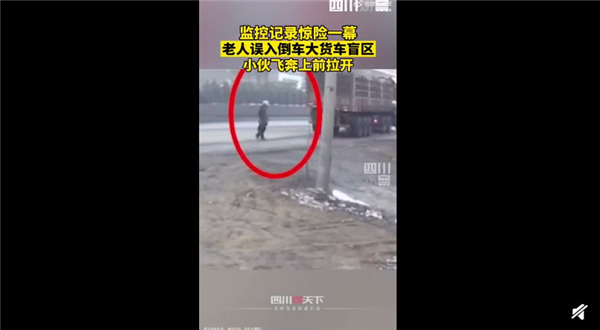 据人民网报道称,1月22日,山西运城一位老人误入大货车倒车盲区。路过的小伙发现后飞奔救人,即使自己摔倒,也竭力拉开老人,最终避免了悲剧的发生。