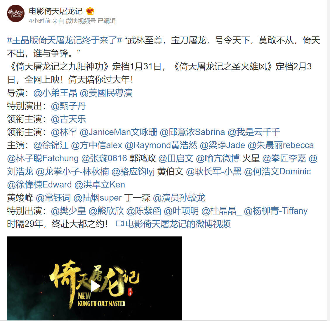 今天下午5点,导演王晶在个人微博宣布新版《倚天屠龙记》定档。《倚天屠龙记之九阳神功》定档1月31日,《倚天屠龙记之圣火雄风》定档2月3日,两部电影均为网络播出。