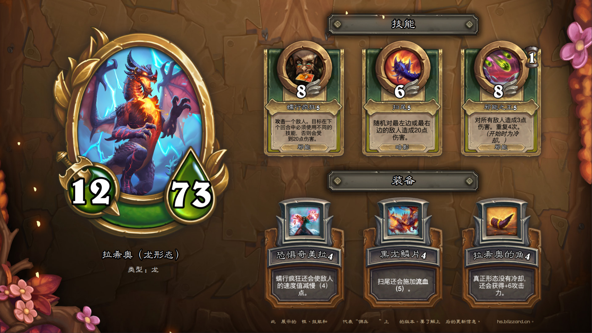 首先我们假设拉希奥确实在第一回合打出了20点满伤害(暴击率就算50%吧),下一回合变形(携带装备3)+6攻击力+20血量/40血量似乎并不是特别的引人注目——众所周知,一个两回合变成18/93的卡好像真的没那么强,横向对比伊利丹早就33点攻击力附带46+66点超高对蓝伤害了。