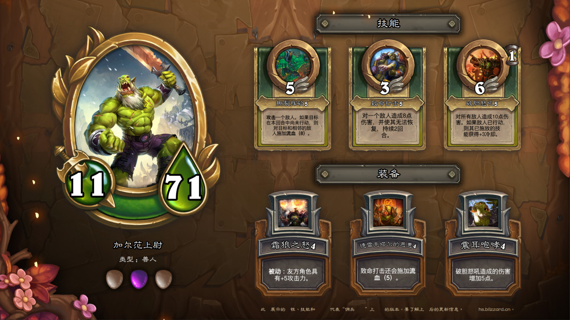 综合来看这张卡不是特别的兼容目前的主流卡组,但很适合原本就初露锋芒的兽人阵容。我们推荐装备1的群体+5攻击效果,配合当前已有的兽人快节奏打法,以2、3技能为辅助手段,直接选择兽人套的硬干打法。