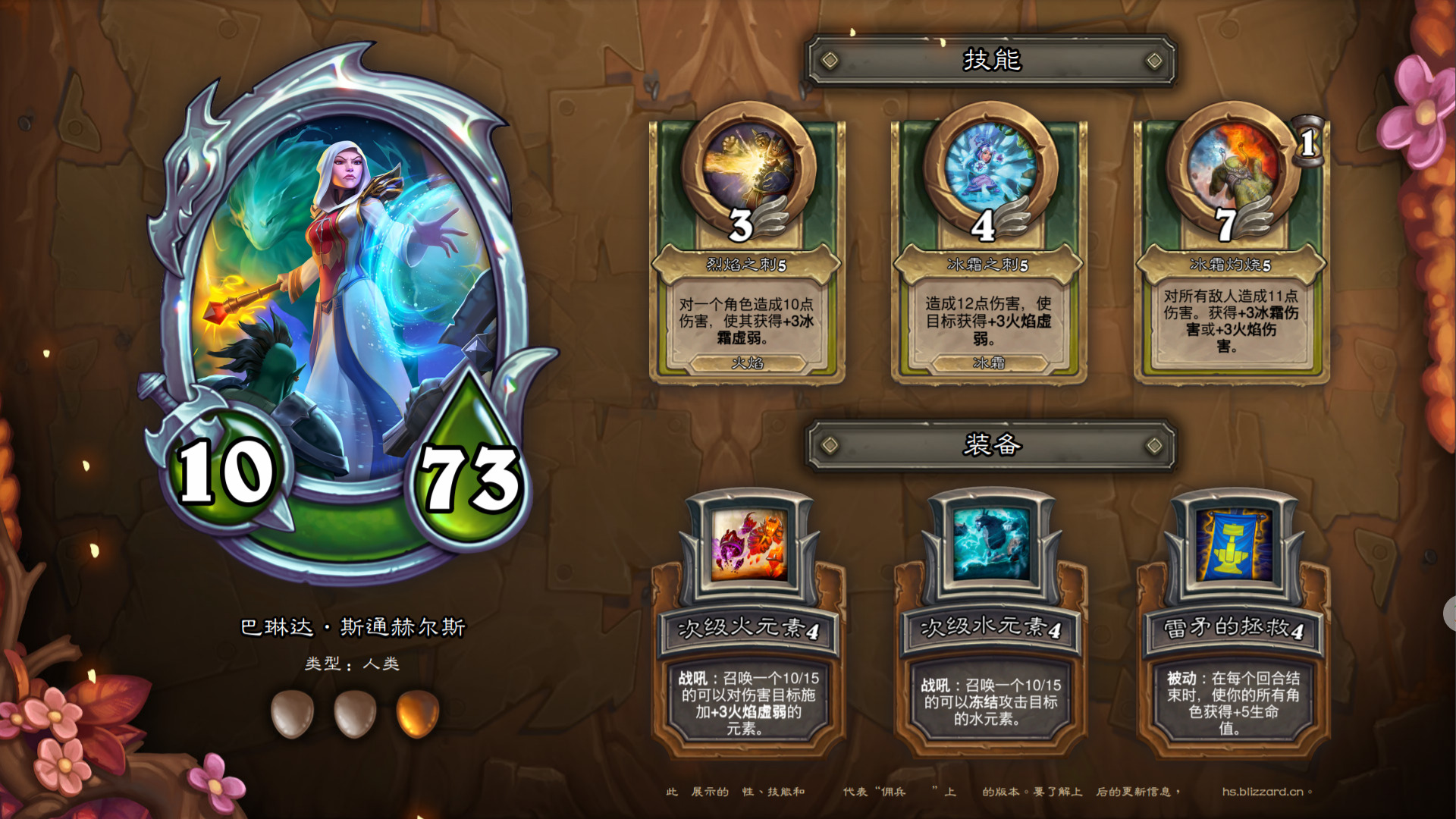 实话实说,这张卡本身的技能强度不是很高(装备有多强咱们后面说~),火焰技能给冰霜虚弱、冰霜技能给火焰虚弱.....很难想象巴琳达可以配合一冰一火三首发,即便如此强度也不是很够格。目前来看这张卡的出路有两个——1、在冰火阵容中充当第3或第4张卡的承接位置,例如兽人恶魔队的古尔丹;2、作为单C卡,直接单上。尤其是打吼瓦队内战时,一个装备2的次级水元素能给对手超高的压力。