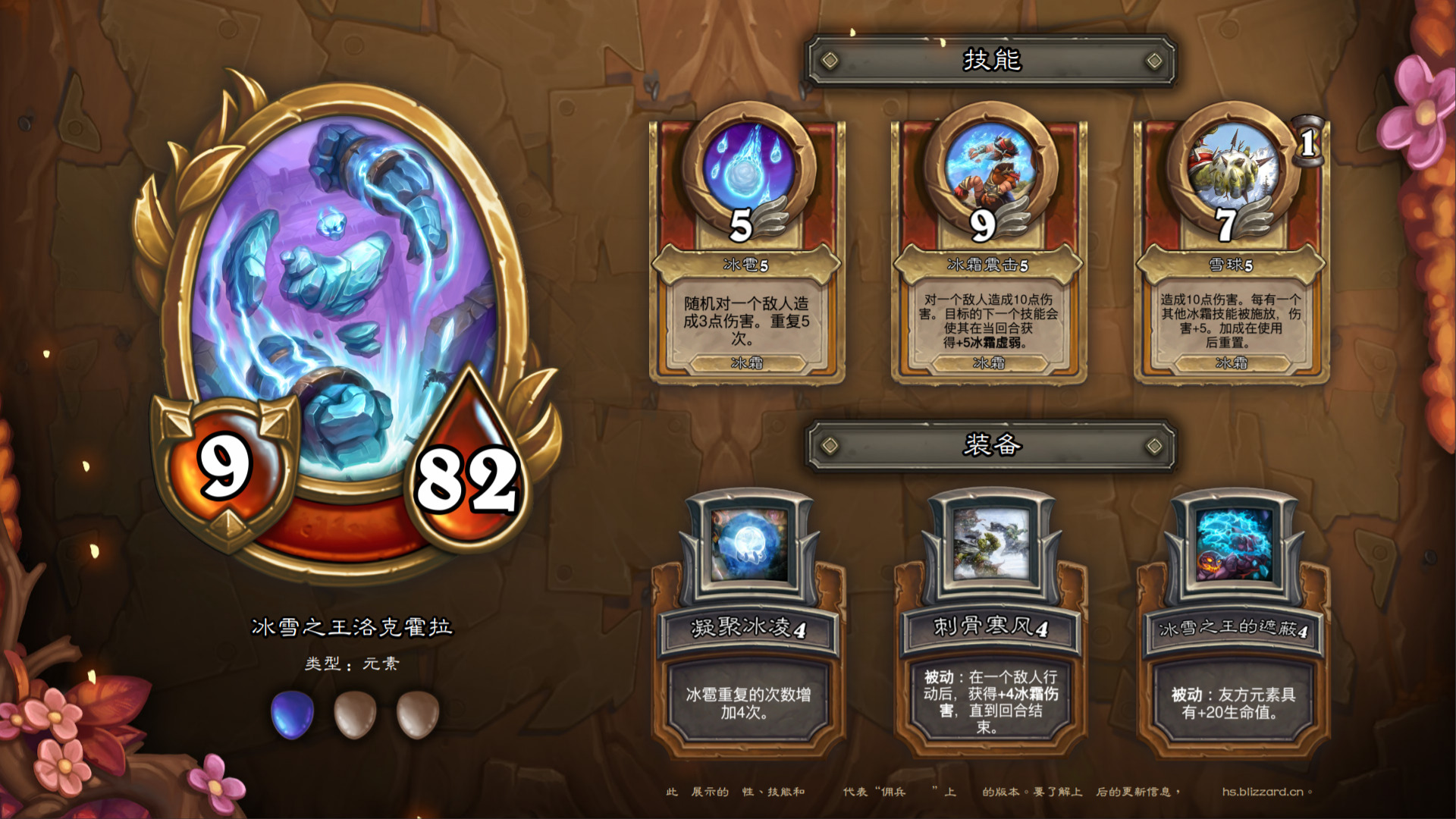 - 次级水元素4:战吼:召唤一个10/15的可以冻结攻击目标的水元素。