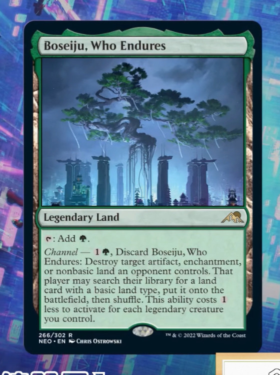 魂力——1G,弃掉~,消灭目标由对手操控的神器、结界或非基本地。该牌手从他的牌库中搜寻一张具有基本地类别的地放入战场。你每操控一个传奇生物,此异能变减少1来起动。