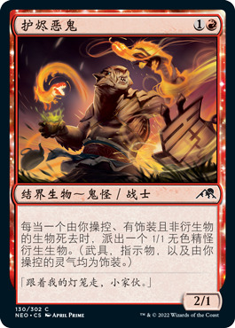 你可能觉得设法加成生物本身就是获得回报的一小步,但神河霓朝纪中的某些牌能让你的回报再进一大步。这类牌会提及「由你操控且有饰装的生物」。这指的是由你操控的生物中:(1)佩带武具者;(2)受由你操控的灵气贴附者;(3)其上有指示物者。为了更好地说明,请看护烬恶鬼。