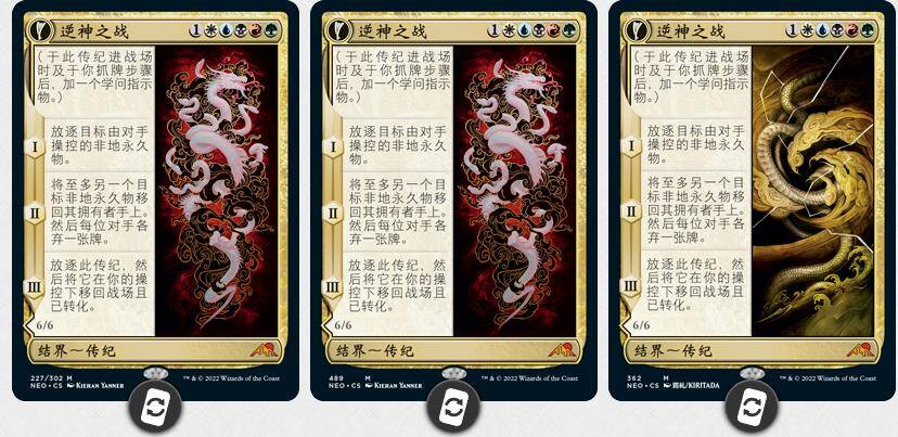 此类传纪牌上还会出现两种新图示。神河世界中有一类称为「现世史家」的叙事艺人,利用舞蹈与音乐承续传统。本系列中也有几位现世史家登场。他们在表演时通常会用到扇子作道具,因此我们觉得这正是描绘此类传纪的最佳选择。在这类牌张的正面,你会见到合扇图示。翻到背面后,扇子已然张开,代表故事正经高潮缓缓落幕。如果一切顺利的话,这也代表你对手的故事亦正缓缓落幕。