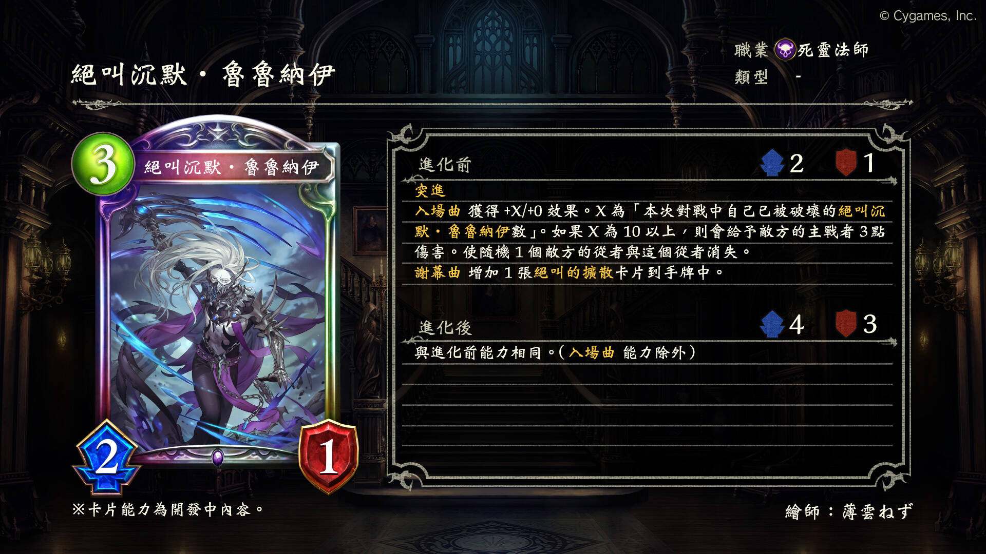 入场曲 获得+X/+0。X为“本局对战中自己已被破坏的绝叫沉默·鲁鲁纳伊数量”。如果X为10或以上,则会给予敌方主战者3点伤害,令随机1个敌方随从与该随从消失。
