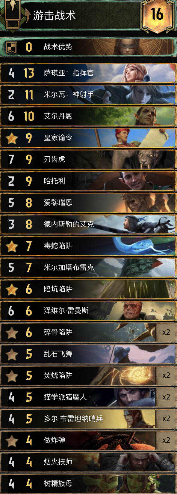 挂载了米尔瓦和萨琦亚,顺便上了个艾克,拼多多杰洛特只要8p,绿龙的9点节奏也不差。米尔瓦可以换成热浪,然后换掉乱石飞舞。带米尔瓦纯粹是因为我热浪老沉(),还能拉高领袖价值。r1萨琦亚打,把杂七杂八的单位牌都打上去。(当然你牌库倒抽r1陷阱全上手的话建议esc+enter)艾克是个人喜好,可以让对手查看3s。打什么都有点把握,就是注意处理好对手的爆点。