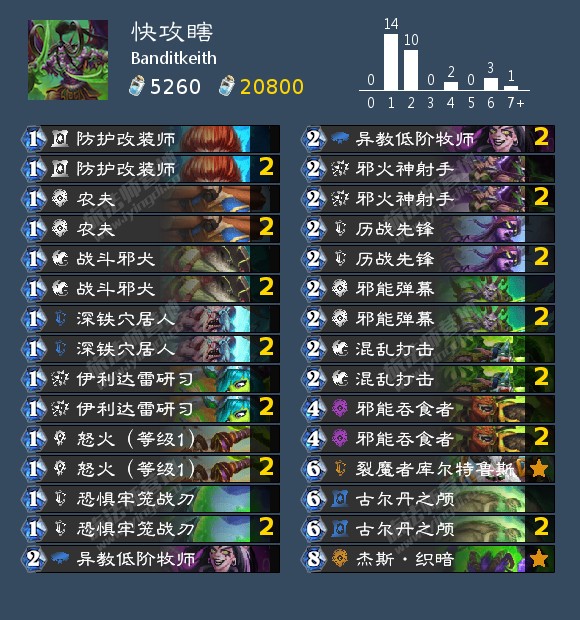 很久没有快攻瞎的卡组出现了,今天分享一套。恶魔猎手走快攻最大的资本是前期用1费的技能控场,快速铺开场面抢血,这点和暗牧前期有点像。标志性的单卡是战斗邪犬+防护改装师。现在恶魔猎手还有二费的邪火神射手这样完美配合这一思路的标准身材生物。后手跳邪火神射手+二费历战先锋也能铺开不错的场面,恐惧牢笼战刃可以在前期补刀控场的时候找机会蹭血量。前期用生物蹭血后中后期比较依赖邪能体系的加攻斩杀,用杰斯织暗复制之前打出的怒火混乱打击邪能弹幕打出爆发斩杀对手。