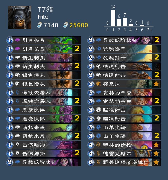 一套构筑比较新颖的T7猎,带上了快攻卡组的上限单卡德雷克塔尔(因为带了这张牌之前的野兽体系就要放弃了,小飞兔没有战吼很弱,犀牛费用冲突)取代的牌是低费更优质的生物,比如一费的银色侍从(一费优质生物对T7猎来说价值很高,能不能在前期贴上狗狗饼干是T7猎前期节奏的关键)除了能拉出低费的优质随从,卡组还带了一些上限,比如三费的穆克拉如果用德雷克塔尔拉出来就能瞬间拉起场攻,书虫是搏一个补充手牌的上限,后期打空手牌单独摸到也有机会去过直伤。原作者还单独带了英雄牌野兽追猎者塔维什,这个卡组六费前有一定的铺场站场能力,更看重英雄牌打出的瞬间挂的两个奥秘,摇动物伙伴随缘,摇出猪更好。这是T7猎构筑上比较大的创新了,上次有这种创新还是单独带一张月牙,我玩了一下这个卡组打了个5-0,感觉还不错但下限比之前版本的T7猎低了不少。