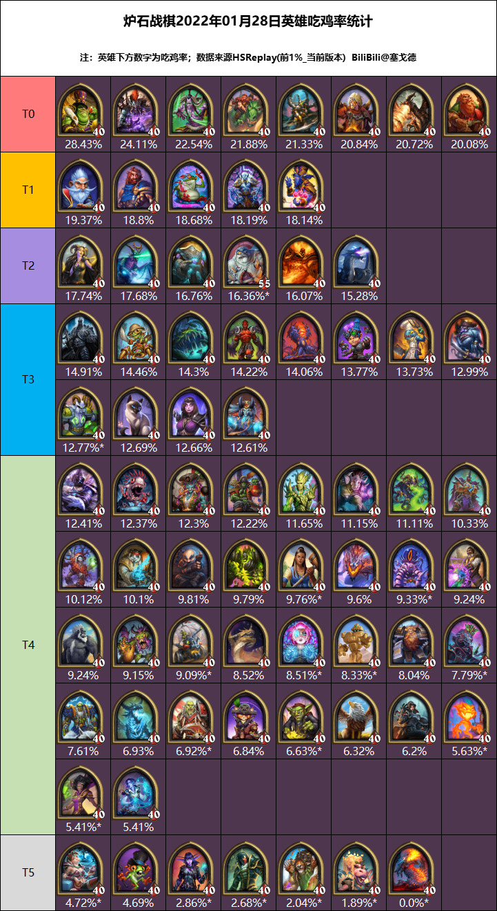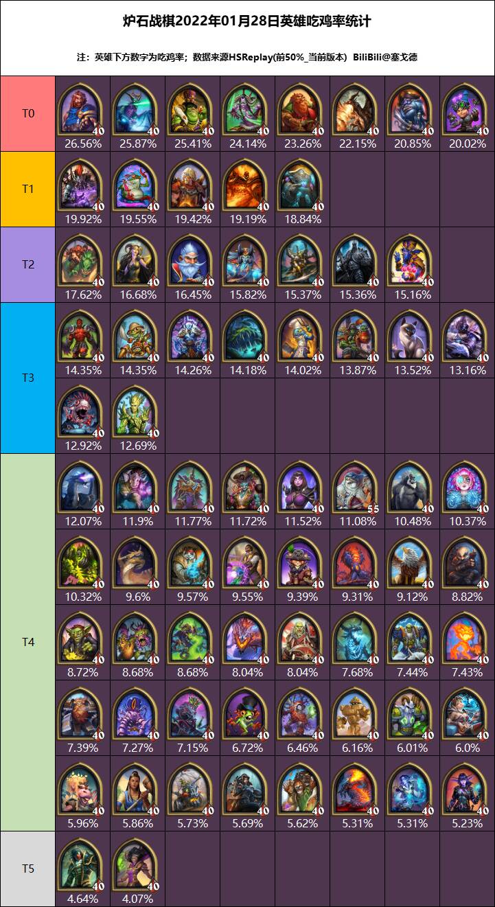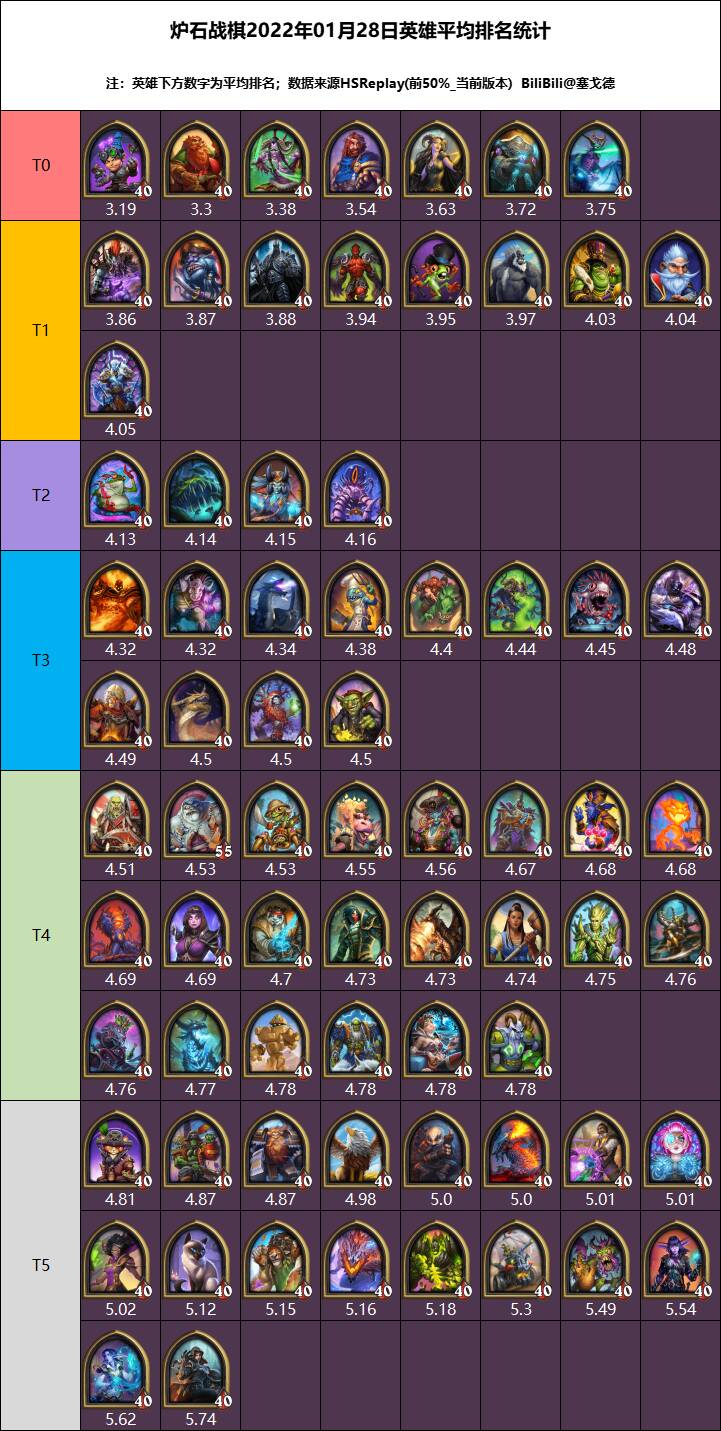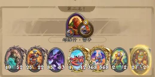 流派统计我就不单独做图了,由于新版本伙伴的加入现在流派分类很乱,很多流派阵容有些莫名其妙,比如养泰蕾苟萨的塔维什·雷矛伙伴是野兽,又带了鹦鹉去触发小黄的圣盾结果被分在了野兽流里;还有馆长拿叉子养宝宝和伙伴,明明是用元素体系叉出来几百身材但由于有铜须和一个毒鱼就被分进了鱼人流,感觉莫名其妙,估计还要一段时间等HSreplay重新划分流派核心才行。