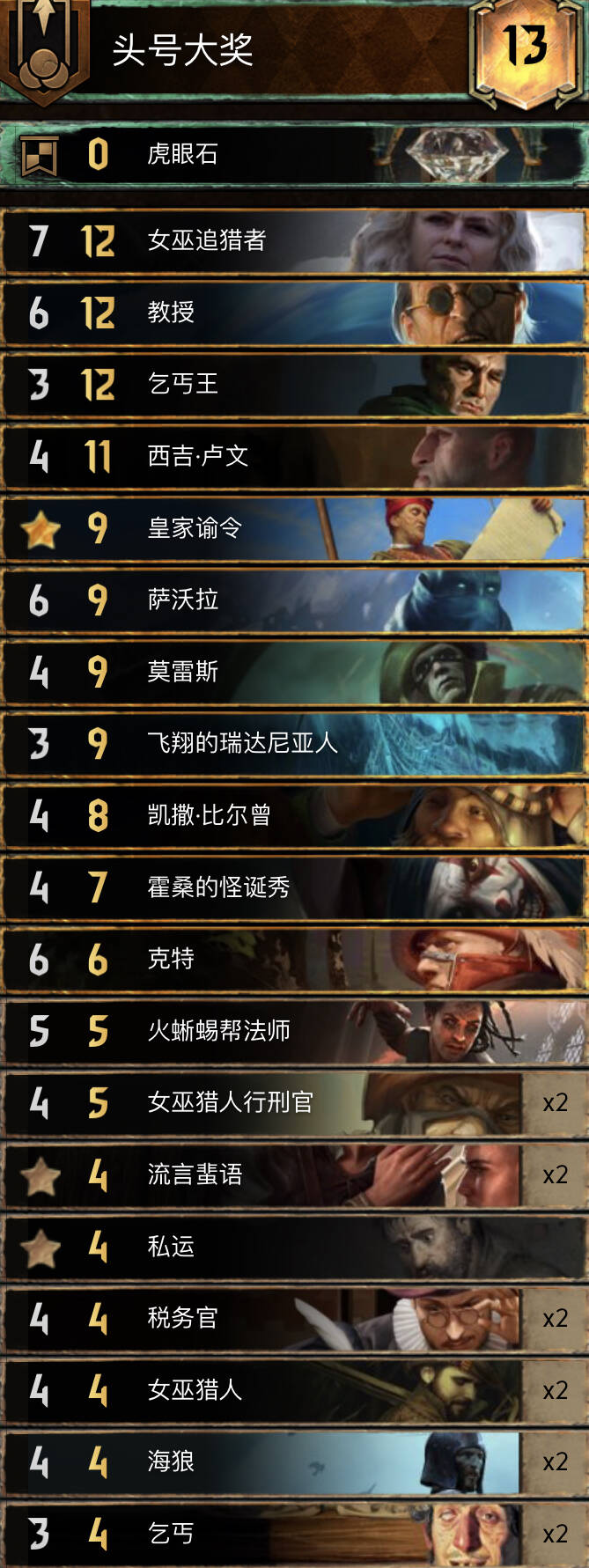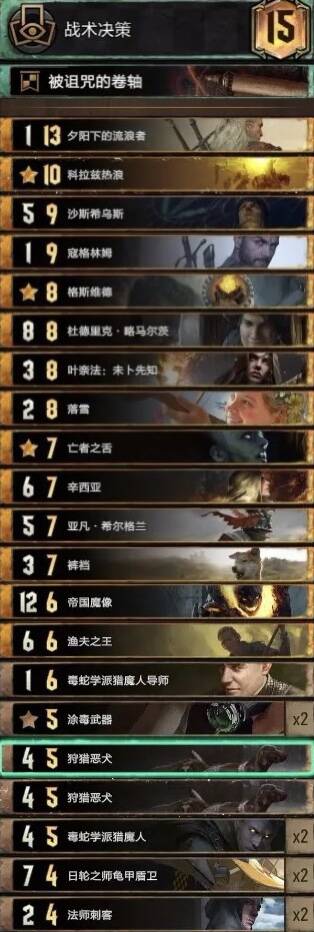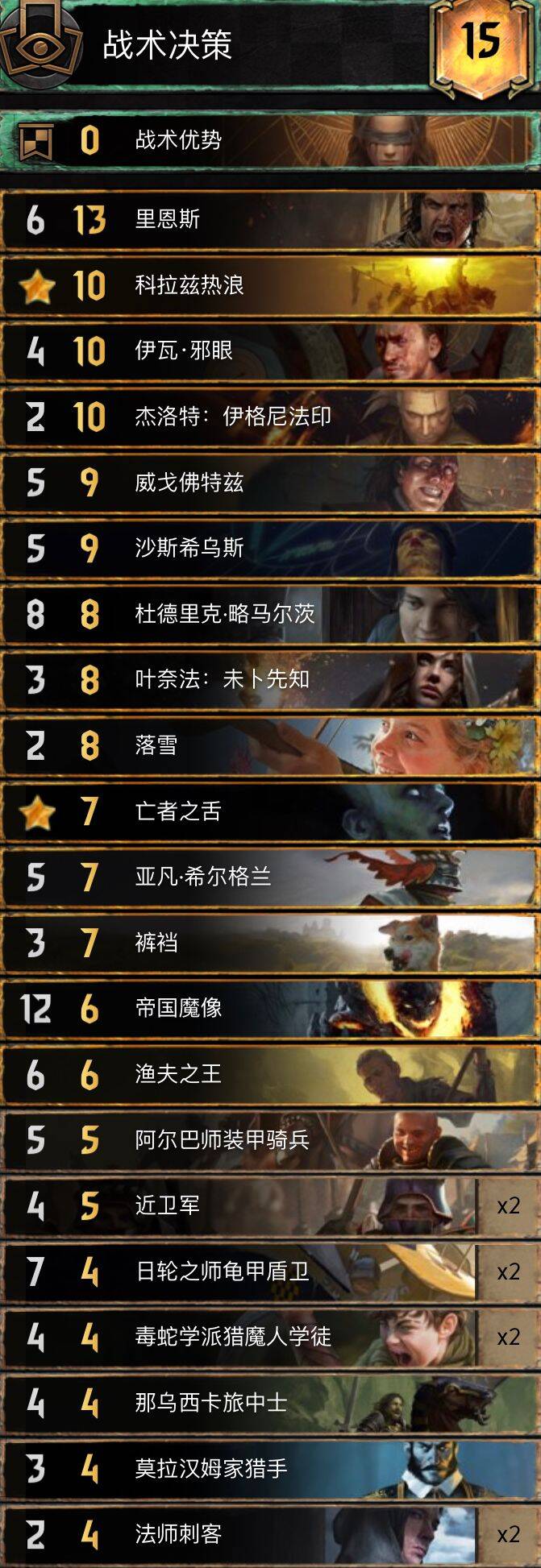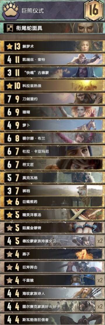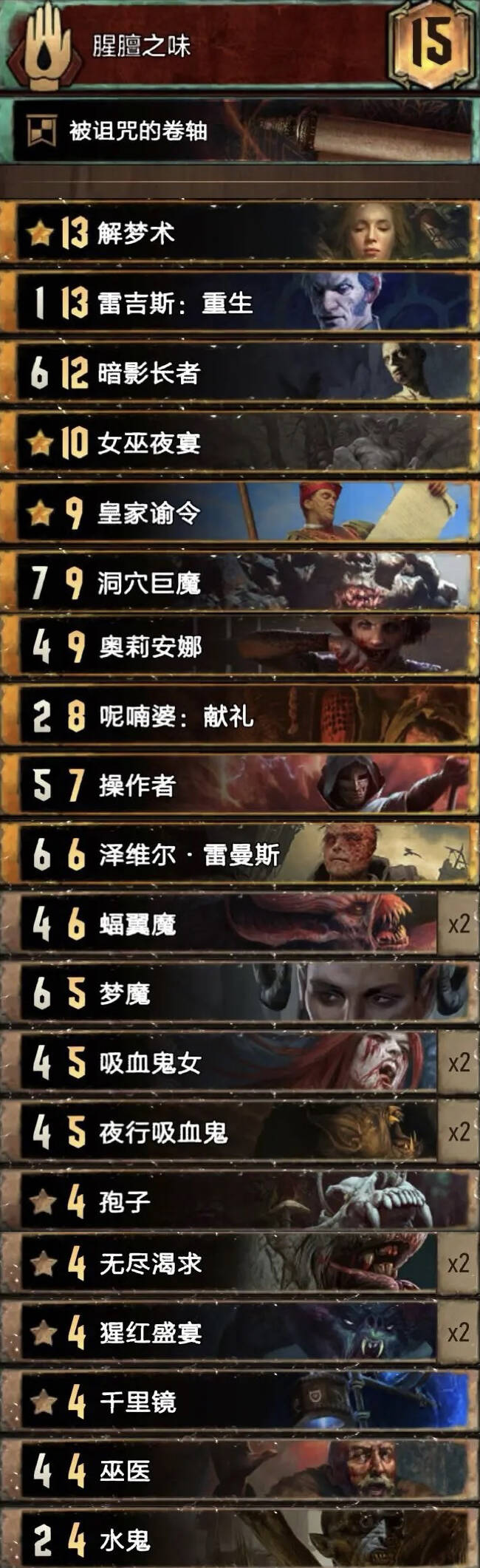想着是卫士保俩挖宝,但俩挖宝大概率不会被解,所以卫士可以换斯崔葛布,r1就凯瑞丝,千里镜,洋葱汤可以摧毁残血金卡,3点就可以用了,裤裆一方面压缩牌库一方面配合洋葱汤,r1攒女卫,r2手上要有古德蒙和解梦,俩挖宝尽量r1交,弃牌组件滤牌很给力,打了很多把了,基本不会说鬼抽卡手(除非脸巨黑),r1尽量拿下,亏卡也拿,r2空过,r3现冥。