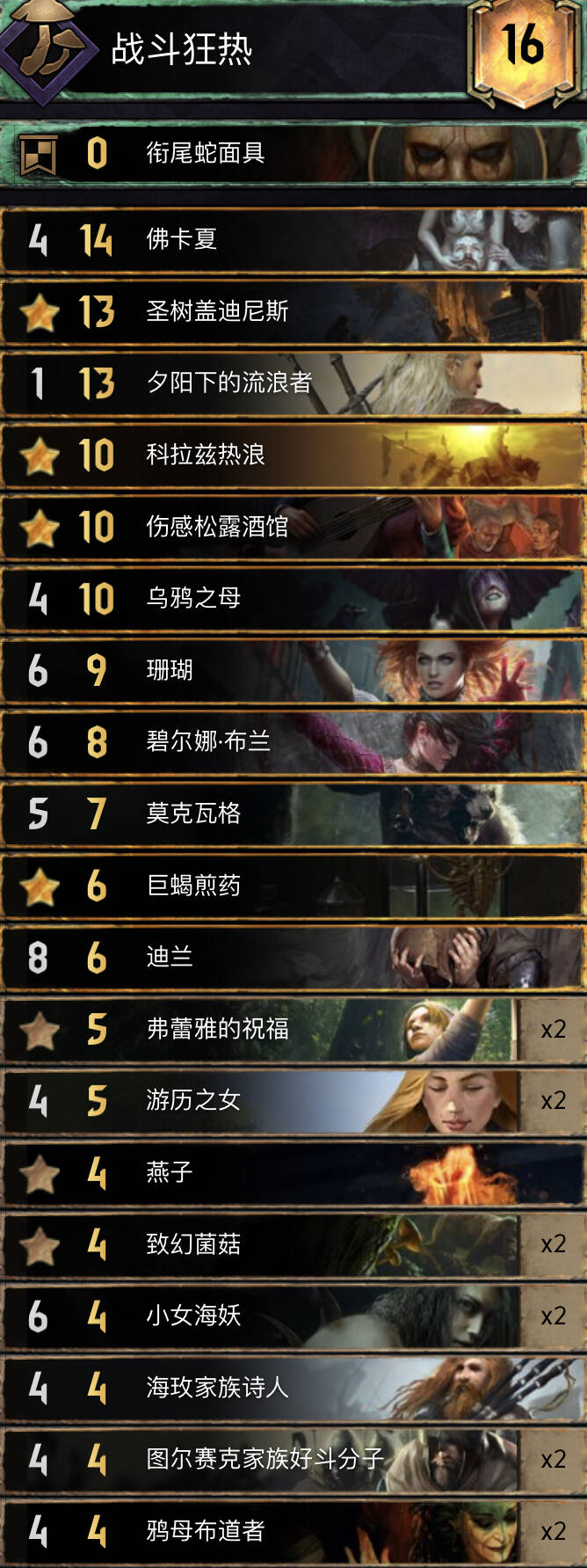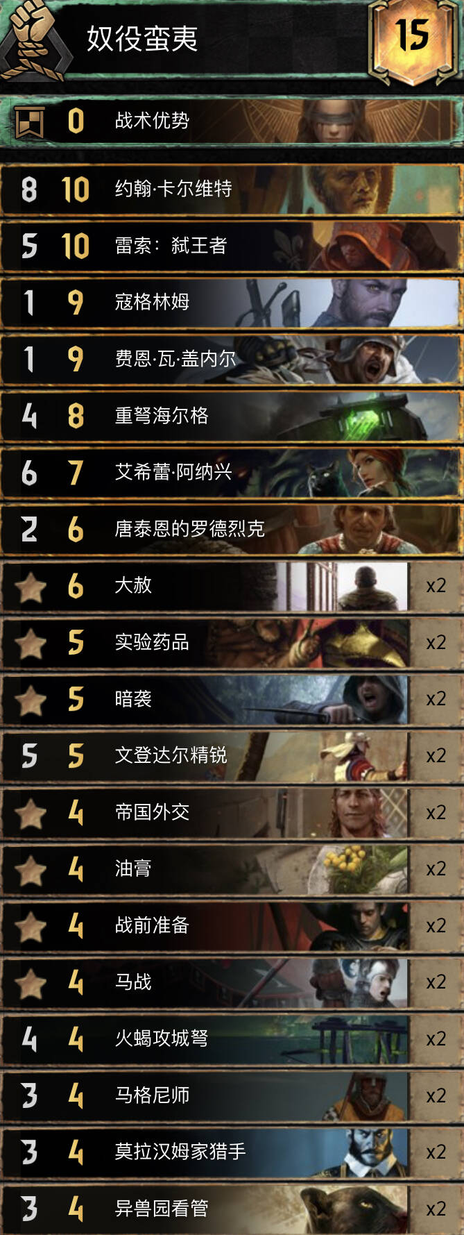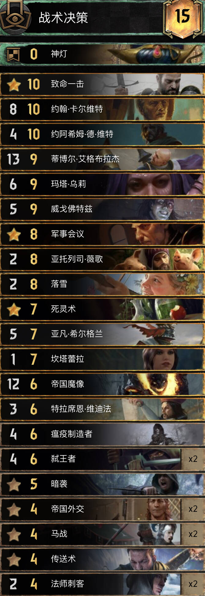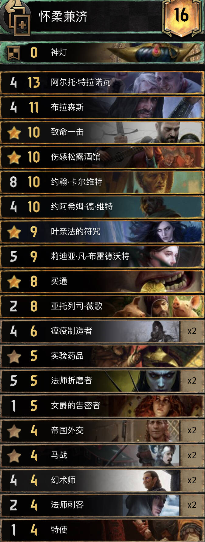 想着是卫士保俩挖宝,但俩挖宝大概率不会被解,所以卫士可以换斯崔葛布,r1就凯瑞丝,千里镜,洋葱汤可以摧毁残血金卡,3点就可以用了,裤裆一方面压缩牌库一方面配合洋葱汤,r1攒女卫,r2手上要有古德蒙和解梦,俩挖宝尽量r1交,弃牌组件滤牌很给力,打了很多把了,基本不会说鬼抽卡手(除非脸巨黑),r1尽量拿下,亏卡也拿,r2空过,r3现冥。