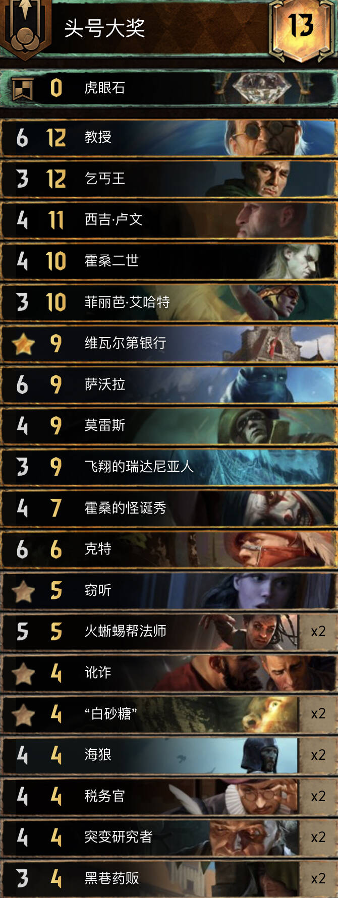 对局思路上,因为有替罪羊,r1后手可以稳定做到三张牌存九块钱,后面无论是抗逼加短r3还是长r3都可以接受。r1先手由于不带虎眼石,所以有一个9点的税务官或行刑官,这是大奖没有的。如果对方r1很强,开一次领袖避免平卡也是可以接受的。