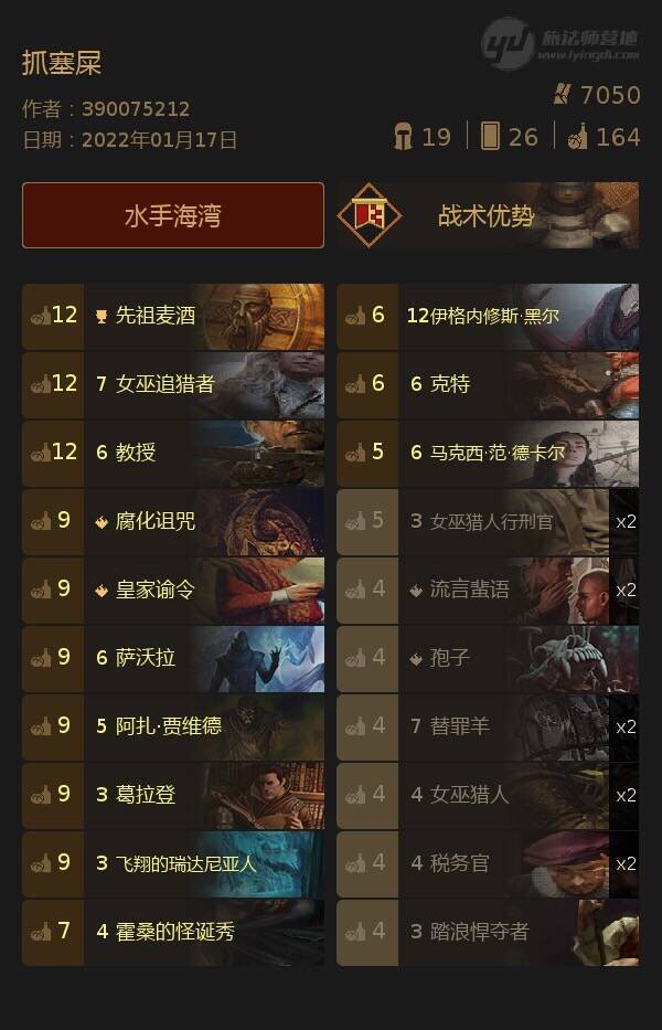 虽然海湾比较缺钱,但用两张硬解配合赏金以及卫士的3利润就能快速提高仓位。2张12点一般是在最后下,其他牌都在7点以下,所以腐化基本不会白板。献金牌用萨沃拉加甲虫卫士是因为大部分卡组不好解甲虫,老奶奶这样的大引擎也非常具有保护价值。而献金牌选择鲁多维西斯和火蜥蜴帮法师会导致中p数卡过多,造成p数浪费。