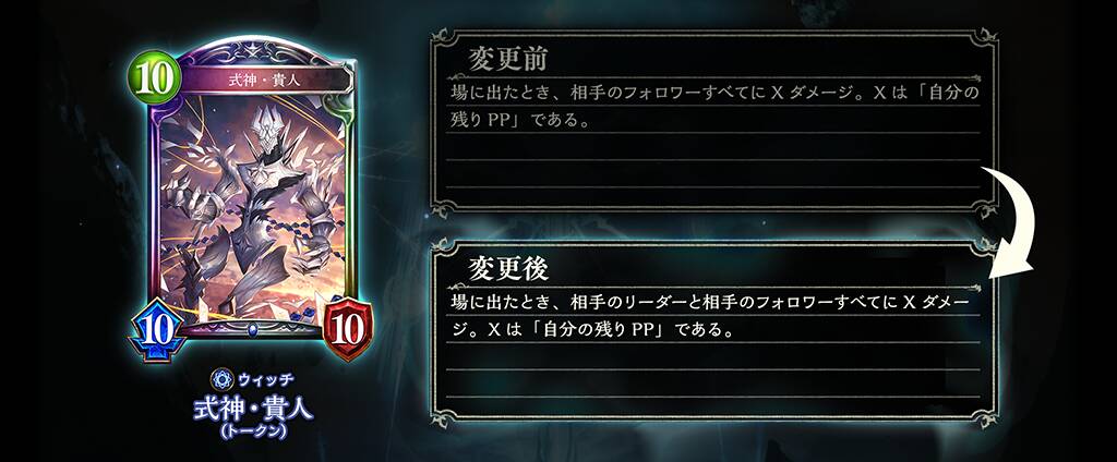 进入战场时的效果从“给予所有敌方随从伤害”变为“给予所有敌方随从和对方主战者伤害”。