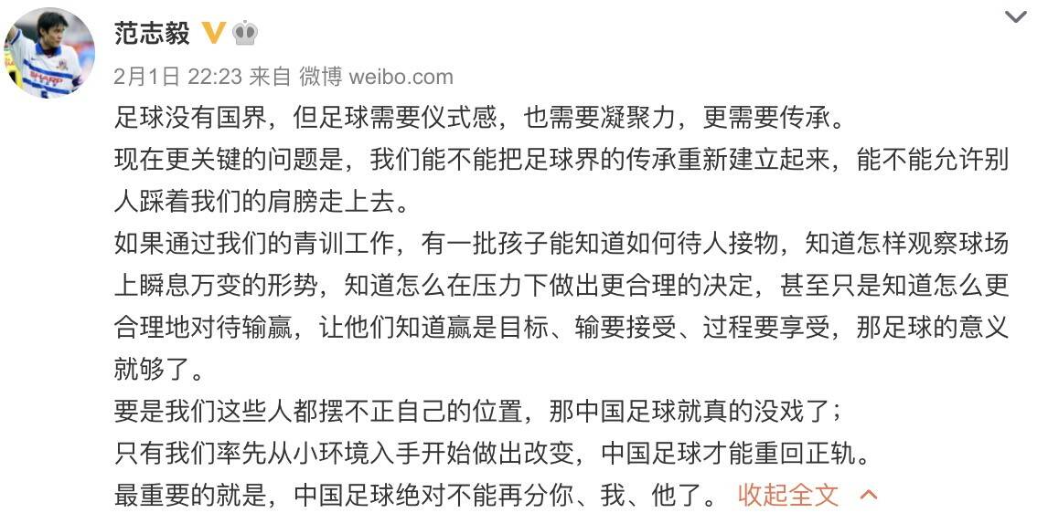 中国足球名宿范志毅也在微博发文称:“现在更关键的问题是,我们能不能把足球界的传承重新建立起来,能不能允许别人踩着我们的肩膀走上去”,他还表示:“只有我们率先从小环境入手开始做出改变,中国足球才能重回正轨。最重要的就是,中国足球绝对不能再分你、我、他了。”