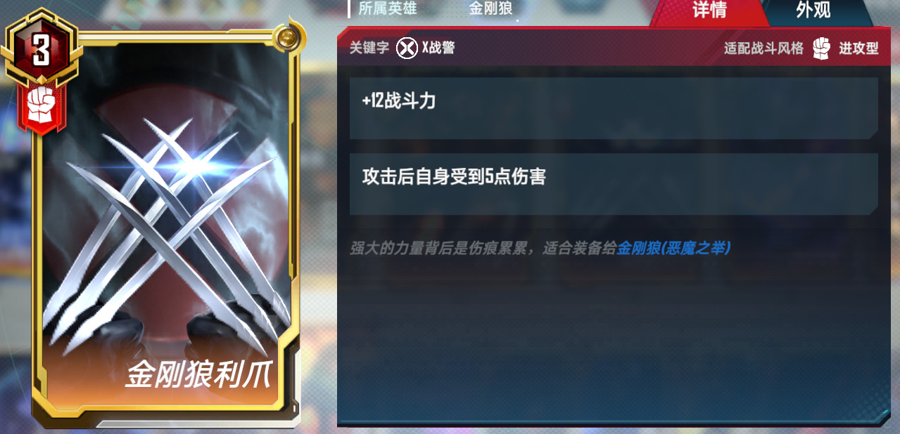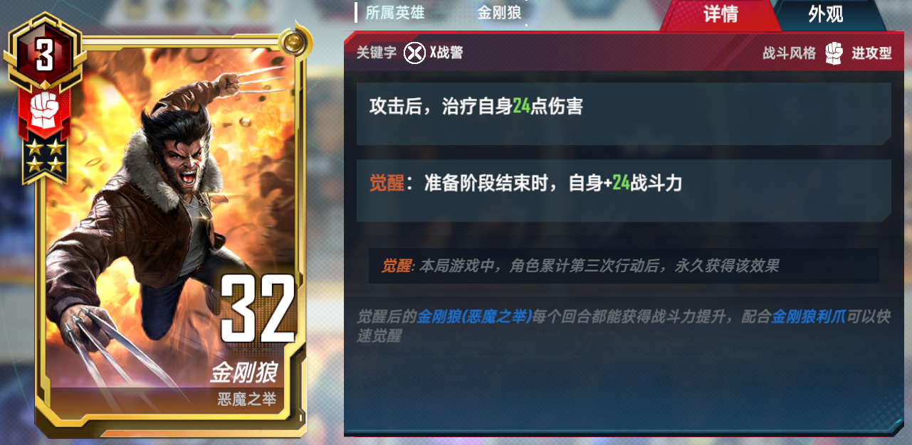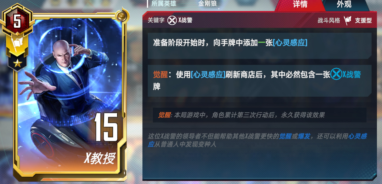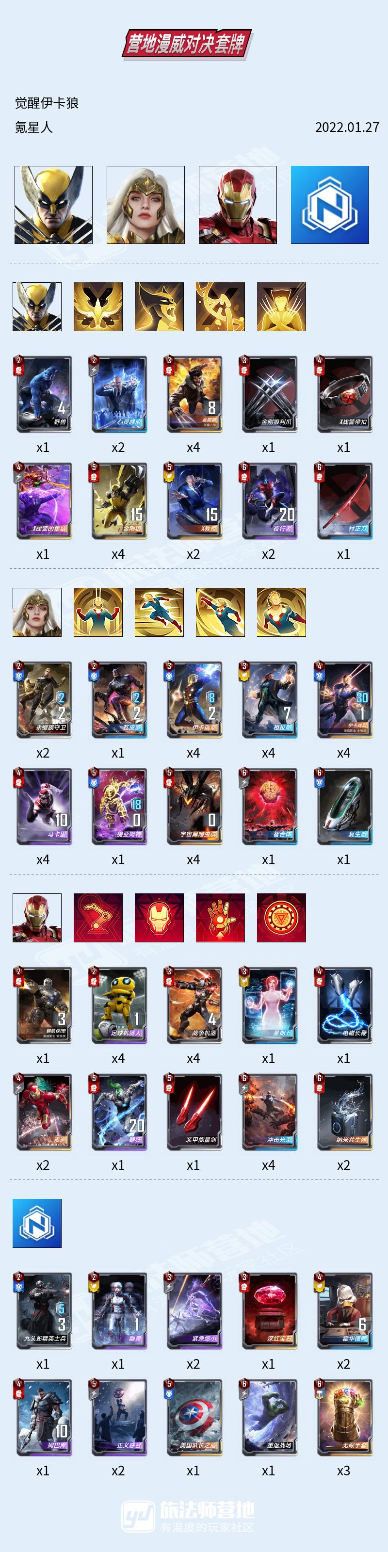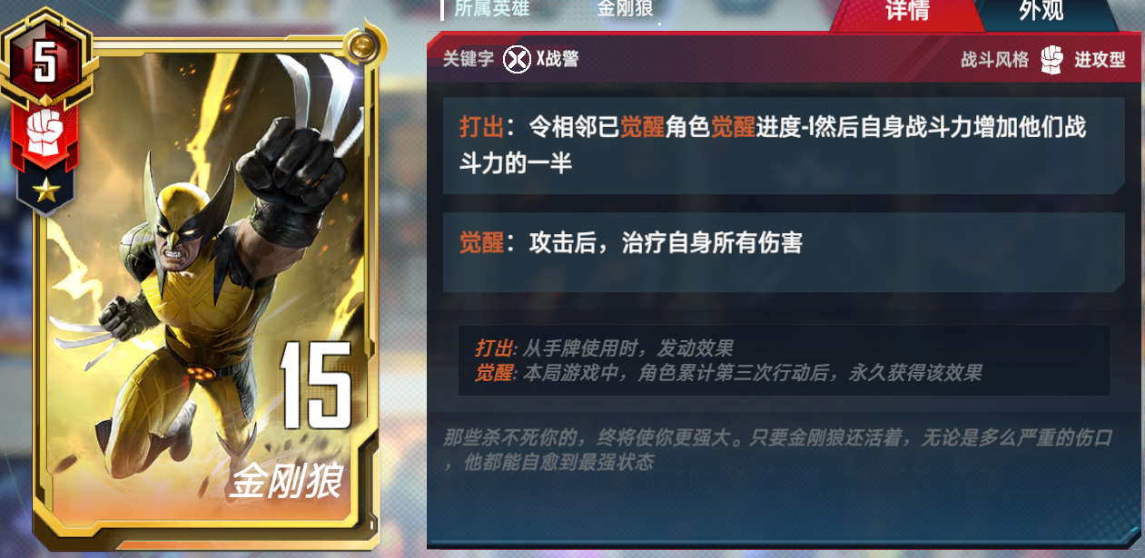 3.万能狼。万能觉醒双核卡组,这套有两个组成方式,在钢铁侠五费上去做选择,万能+隐匿,或者是万能+能量剑。优势是格子不会太紧张,曲线比较平滑。