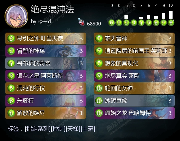 解放的绝尽能在被混沌、想象或莱欧减费后赚取额外费用,提升混沌法上限。想增加消耗能力的话,可将其替换为飞向未来(想投入第2张飞的话,可减少1张阿莱斯特或原始之龙·巴哈姆特)。