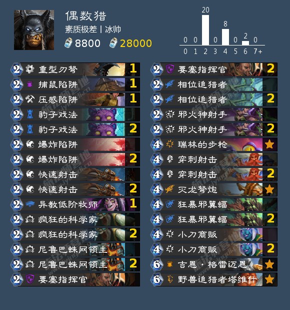 这套偶数猎跟上版本的大同小异,奥秘选择上还是经典的六奥秘体系,只是因为点燃法的灭绝,去掉了狙击,压杆陷阱是counter橡树的召唤的神器,另外说说重型刃弩和觅血者的选择,前者更偏向抢血,而后者更偏向控场。值得一提的是急速射击虽然改成了两费,但是性价比还是太低了,不适合偶数猎的快节奏。