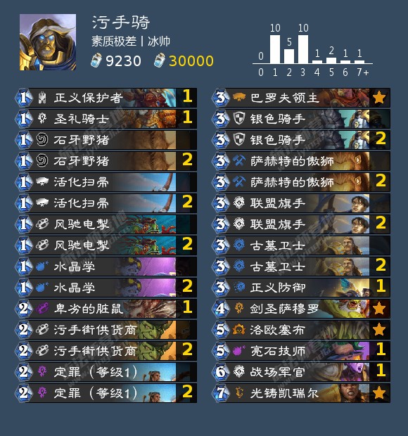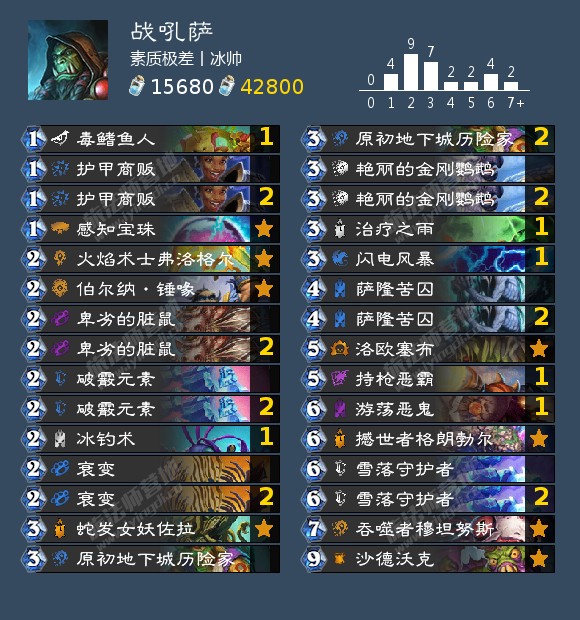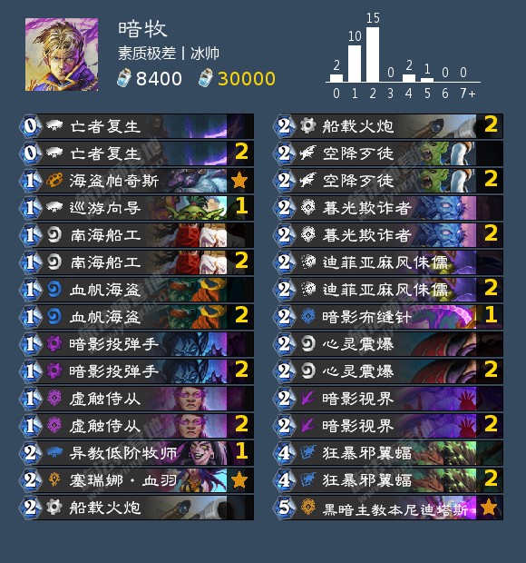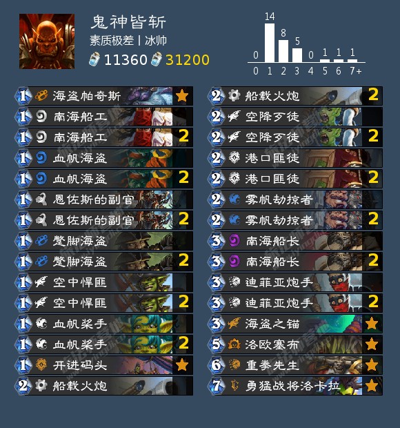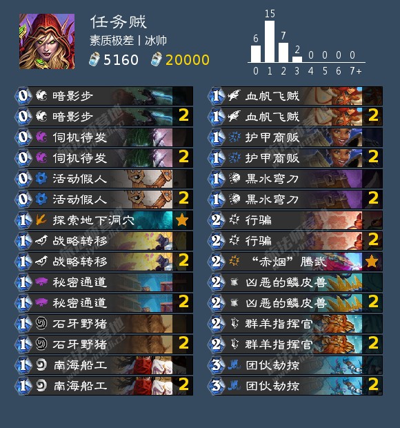 作为一名战士死忠粉,讲道理这版本海盗战还是勉强能玩的。不过现在任务进度加了一个,蹩脚海盗一定要满编的,而且不能再带圣剑扳手了,否则做任务都很困难。卡组亮点是加了一张ak,勇猛战将洛卡拉加强之后,可以作为快攻内战的一口大奶,尤其是打暗牧这种直伤型快攻尤为好用。另外洛卡拉给的无坚不摧之力可以用来撞萨满的雪落守护者来斩杀。