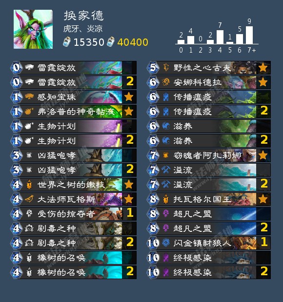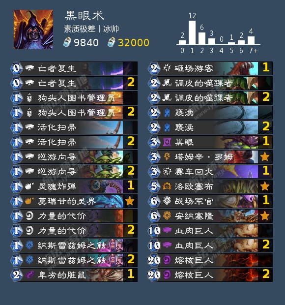 这套跟老版巨人术差别不大,目前被证明针对萨满最好的卡位是砸场游客,因为它本身强度高针对面也更广。因为环境的降速带了一张黑眼和灵魂炸弹来提高卡组的上限,快攻多的分段建议换回双脏鼠单豺狼人的老构筑。