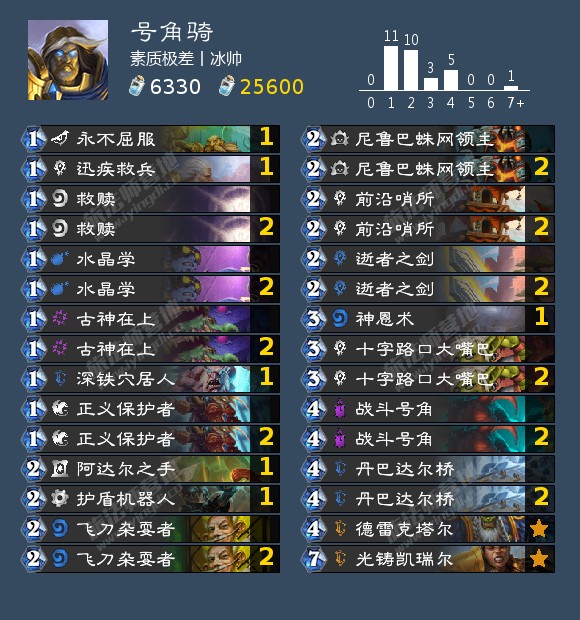 现在叫这套号角骑更适合一些,因为天梯再无奇数猎,也没有带防护长袍等针对卡,值得一提的是因为环境的降速,卡组带了一张ak来打变速,光铸凯瑞尔不但可以防鬼灵贼等otk,更是卡组后期的一张梦想卡。