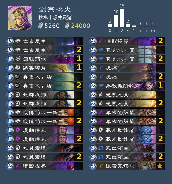 现在高分段的暗牧基本都是海盗暗牧,因为盗宗上限更高,抢血能力更强,而剑宗暗牧往往吃一个退化就崩了。值得一提的是血羽这个卡位非常精髓,众所周知暗牧是没有处理大怪的能力的,血羽进可以吃受伤的掠夺者,退可以吃巨人,就算吃一个脏鼠也是赚的,非常适合当前版本的环境。
