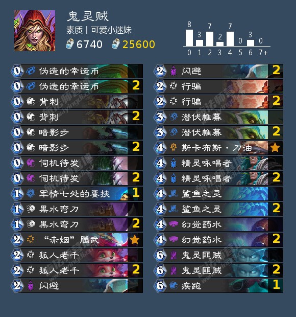 任务贼的构筑已经很完善了,基本都是过牌拉满,其他就是做任务卡和抗快攻卡位的抉择了,这套带了五张回手,随从回手只带了一张最强的滕武,护甲商贩、活动假人和麟皮兽用来提供快攻抗性,大家也可以根据环境把护甲商贩换成冰川裂片。