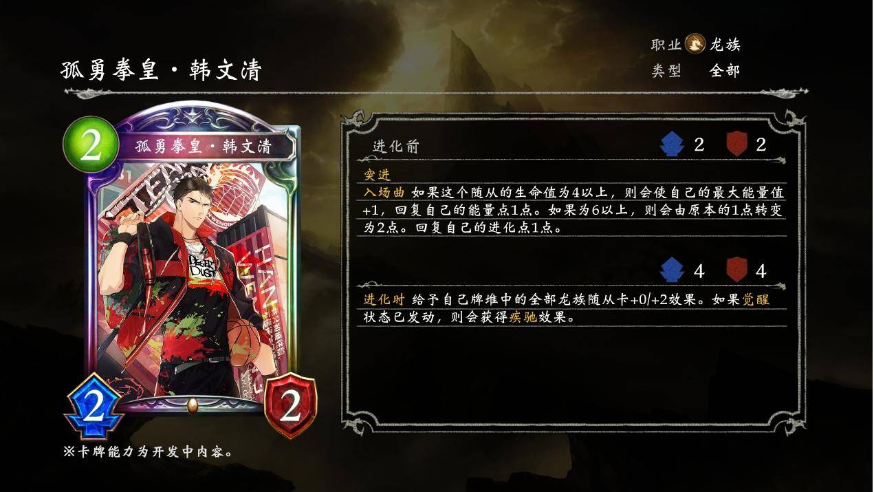 入场曲 如果这个随从的生命值为4以上,则会使自己的最大能量值+1,回复自己的能量点1点。如果为6以上,则会由原本的1点转变为2点。回复自己的进化点1点。
