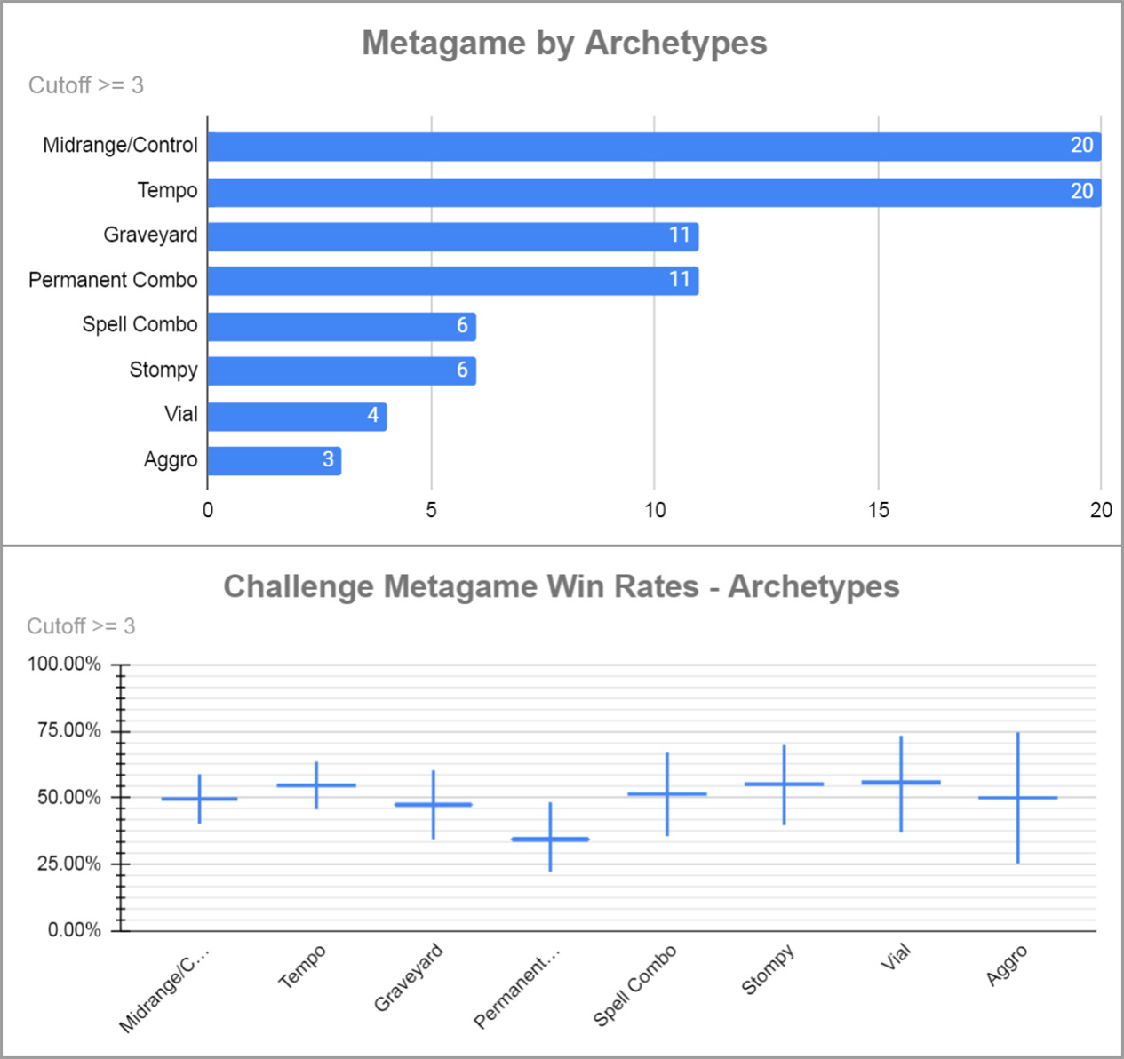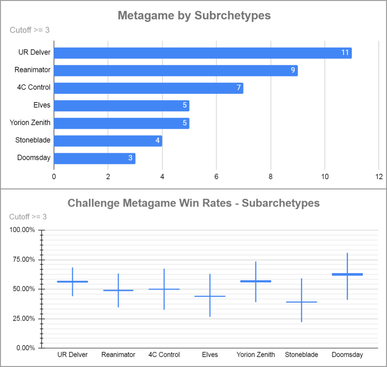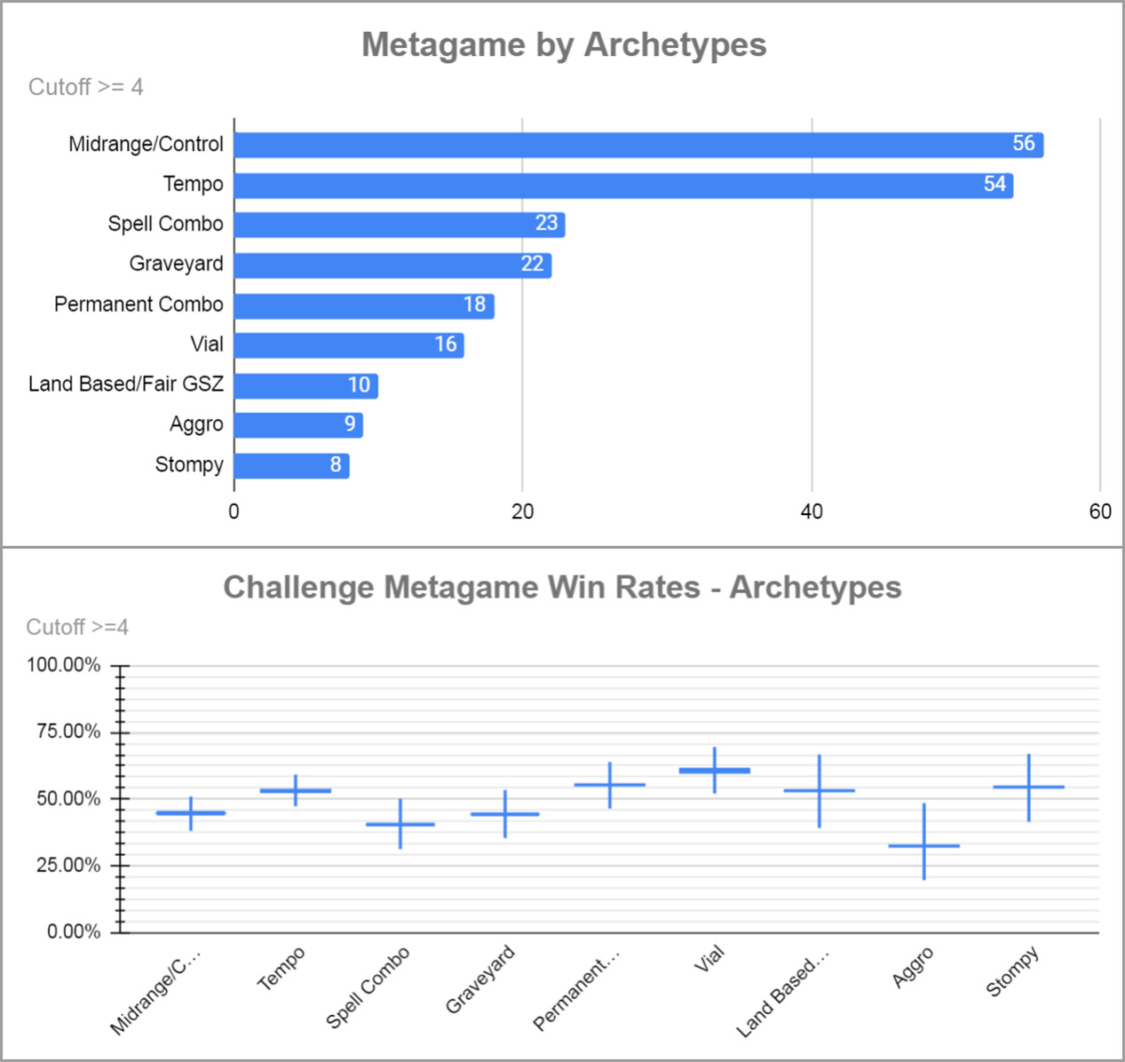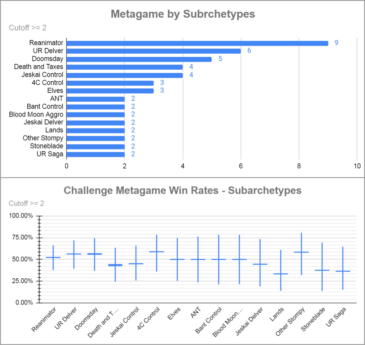 即使周日已经进行了一场 Showcase 挑战赛,当天的常规挑战赛还能照常举办,有64人参加,其中许多人都是两场比赛同时打,太热爱薪传了!下面是套牌分布情况(感谢 Legacy Data Collection Project 对比赛数据的收集和整理)