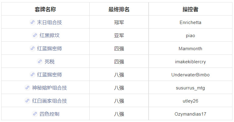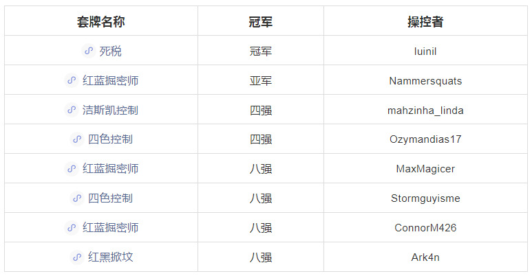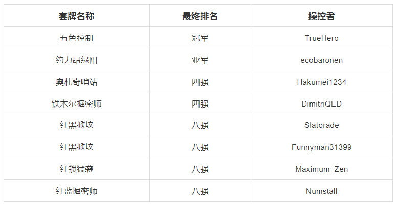 这场比赛里有许多掀坟套牌和红蓝掘密师,它们的表现都很不错。比赛共进行6轮瑞士轮+八强单淘汰,下面是最终的八强排名