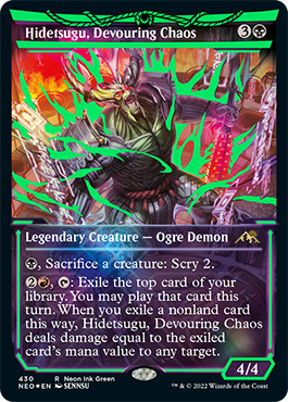 噬生浑魔碑出告这张牌使用了特殊的霓虹墨绘处理,它在补充包中会以霓虹绿色、蓝色和红色出现,但是黄色只会见于WPN优质店的赠卡。