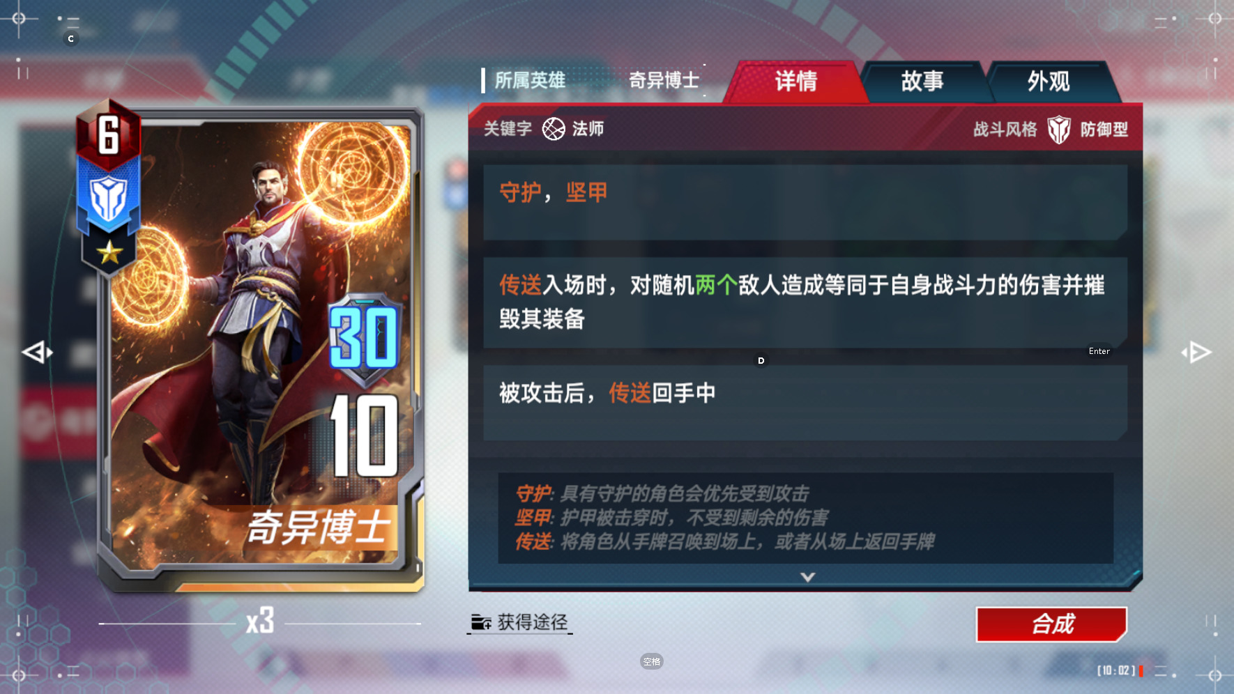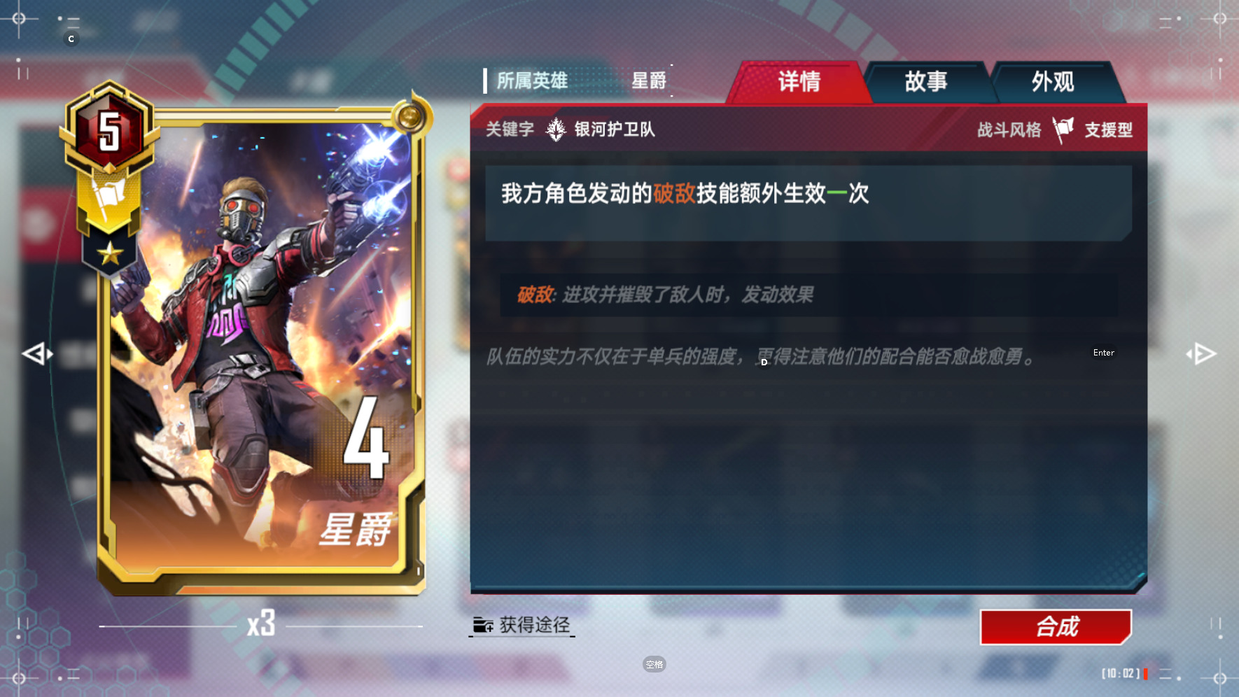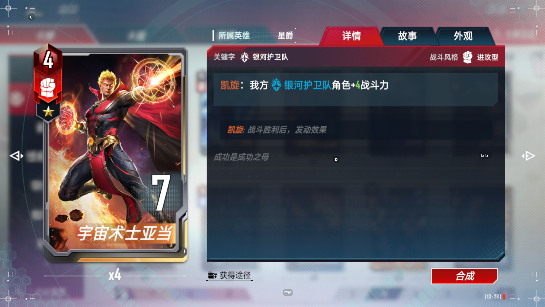 诱导目标:亚当。和上面类似的情况,本来我认为万能和亚当的诱导条件都是红卡造成物理伤害,但是这场对局就没法解释——如果亚当和万能的诱导条件都仅仅是物理伤害的话,我场上3个这么大的银河护卫队角色打了绝大多数输出,应该发亚当才对,怎么给的是万能?后来又单独测试了许多次后给万能的诱导条件加上了“通过角色技能给我方角色增加战斗力”。这样就能解释这场对局了:是因为两个星云的破敌加了大量战斗力导致诱导出万能。然后我按照这个假设尝试了全蓝诱导万能并取得了成功: