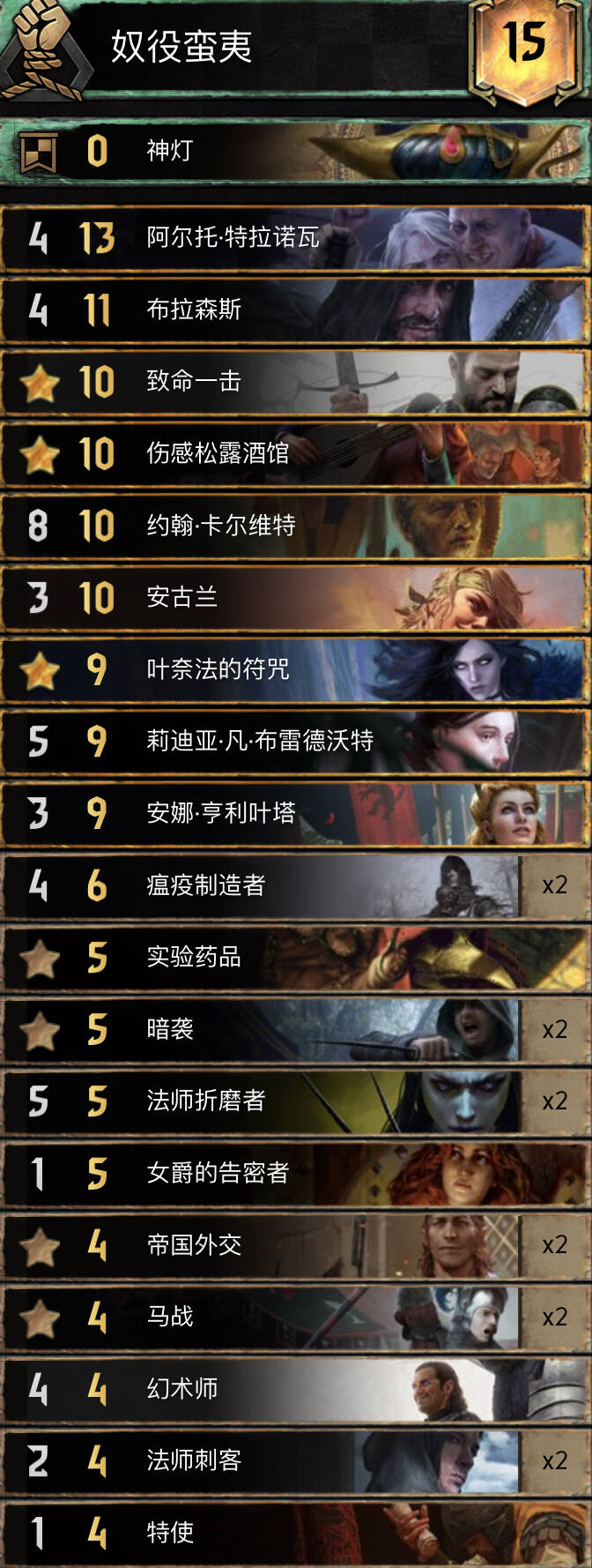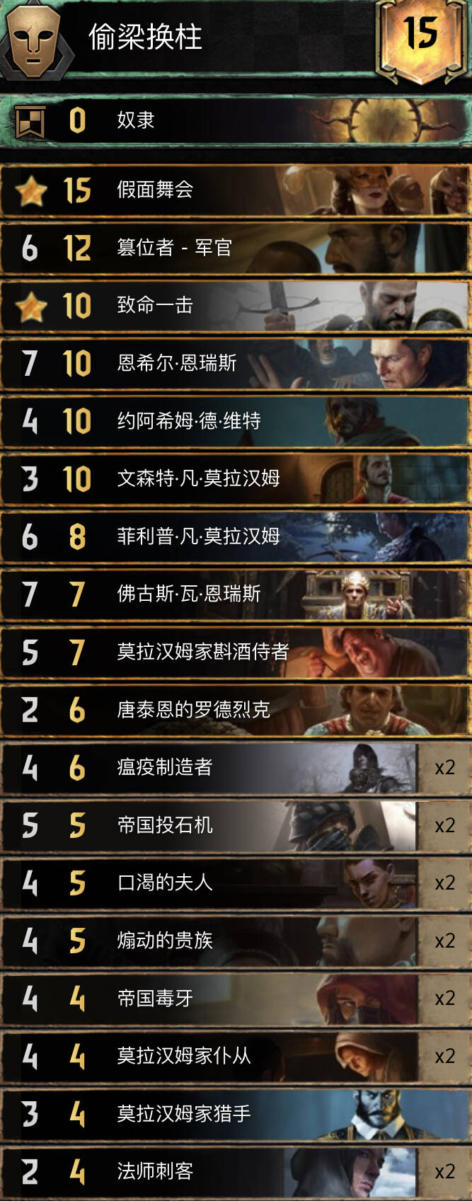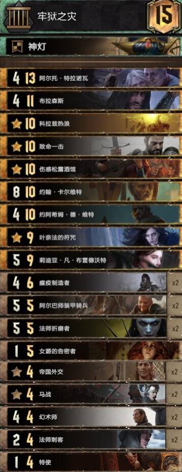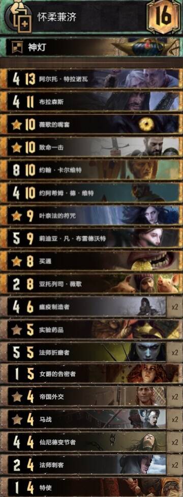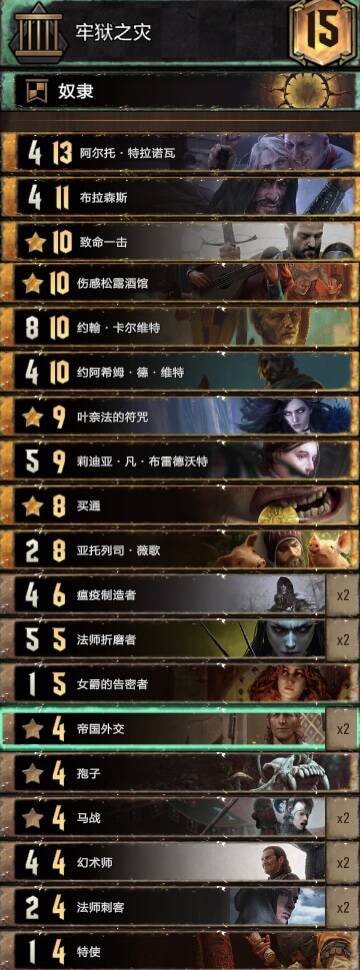 首先要感谢B站蛙蛙hz,这套卡组属于是看了他的视频后改良而来的。这是套双核卡组,核心分别是毒(剧情和小毒)和潜伏(恩希尔,佛古斯,血剑和煽动贵族)。赤诚的优点就是点数更大,可惜符咒实在塞不下了。篡位者R3可以配合密探加点读剧情,也可以给夫人和煽动贵族涨点。血剑一下留给约阿,另一下可以配合潜伏偷牌,也可以打罗德列克捞金(剧情没上手时尽量别捞其他金)。煽动贵族可以配合恩希尔(大帝小局开始时优先下场)和佛古斯最后两手下部署爆点。望族多不怕剧情白,夫人留着读剧情最佳。瘟疫爆点滤牌,猎手控制。感觉锁少可以把一张法师刺客换成猎手。小技巧:重复施加已有的状态,仆从和已在场上的夫人及煽动贵族也能涨点。