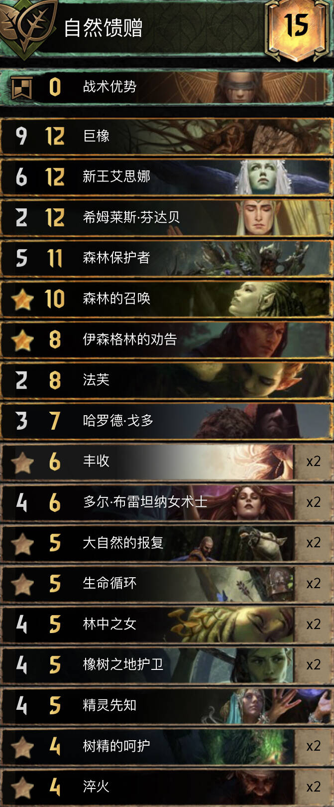 现在版本的叶子大多是外挂跳跳体系的,但这版本解牌太多并不吃香,且也不能发挥共生的优点。反而是林女和橡树护卫这种解了也不痛不痒,或者是女术士和先知这种不死立刻就能开出来爆点(有奶有净化及存点)的牌比较吃香。所以就文艺复兴了一波。新加入了巨橡,解决了小叶子缺少决定性高P大金的老毛病(女装什么臭弟弟)。检索滤牌有岳父,法芙,劝告,召唤,十分稳定。大多是小伤害控制,可以让橡树护卫和女术士提前站场加伤害,或者岳父双打3打5。