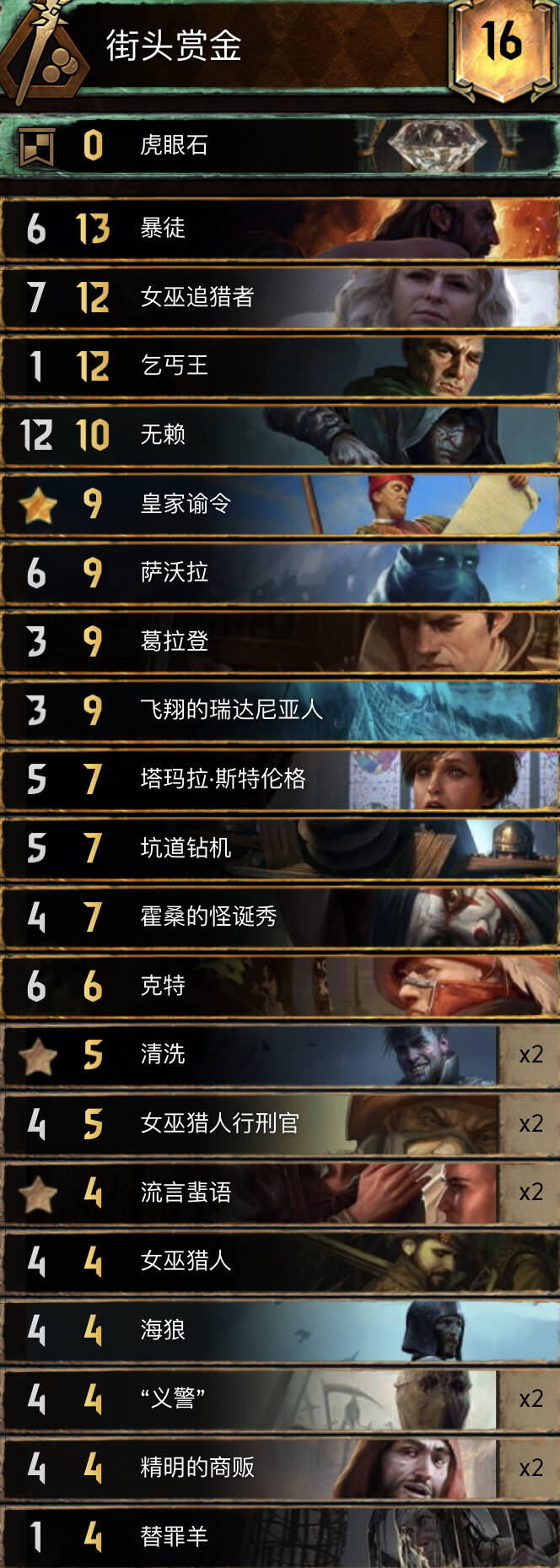 玩赏金最重要的一点就是不要心急。赏金总是一个萝卜一个坑,一个标记一次出击慢慢来的,它不像霜怪那么直接。面对茫茫多的绿字时即便是老奶奶站场也会打光老本,只有配合义警才能把钱越解越多。赏金体系的塔玛拉在迎来乞丐王后产生了质变,因为之前塔玛拉相较于北方的狮鹫老大要亏钱。获得BUFF后的行刑官、义警都被抬到5血是更难以被解,同时也让这套牌的R3纯点数大得惊人,时常能赢到20点左右。清算是给这套卡组带来最多惊喜的一张牌了。配合一个行刑官站场它往往能一张牌解两个引擎,更别提它还能强解遮蔽,或者配合之前的标记直接兑现。